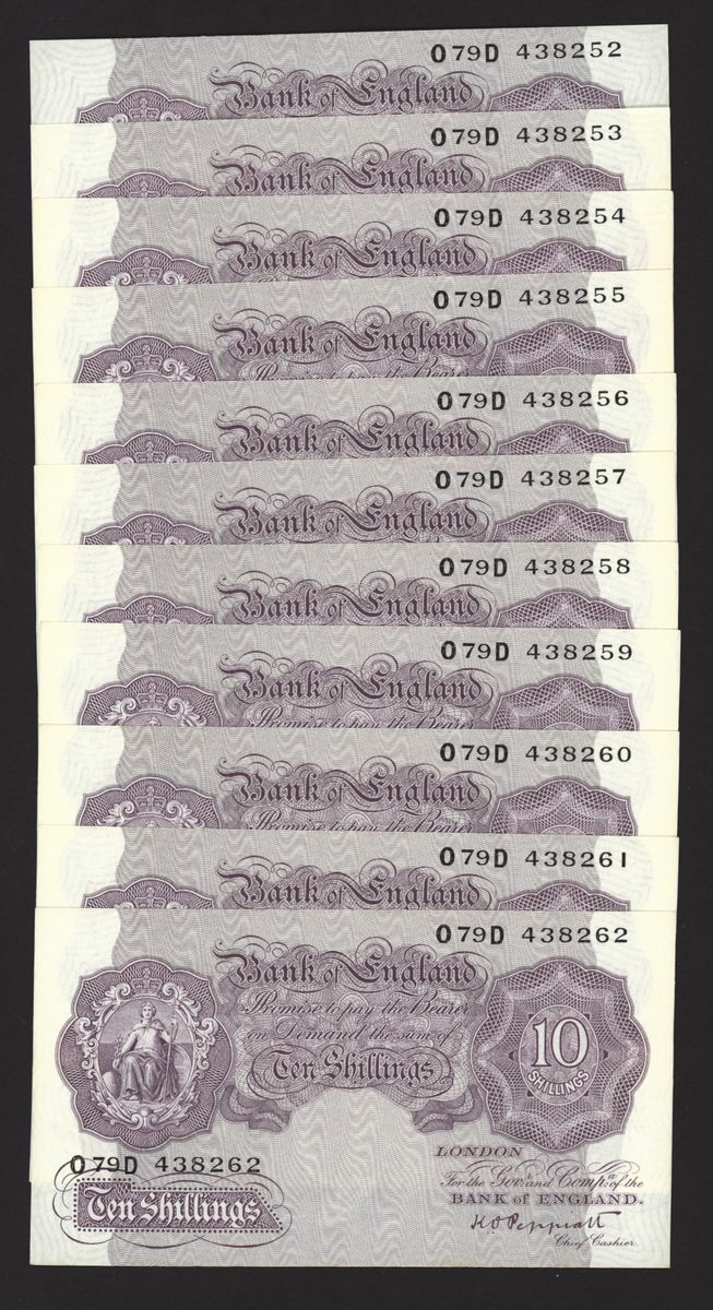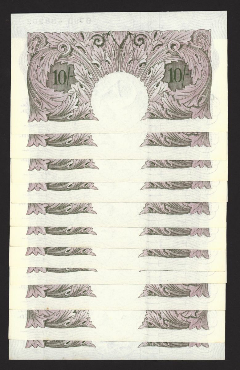 Bank of England, [11 notes] 10 Shillings, London, ND (1940), K. O. Peppiatt, mauve emergency war issue, consecutive run, nos. O79D 438252-438262