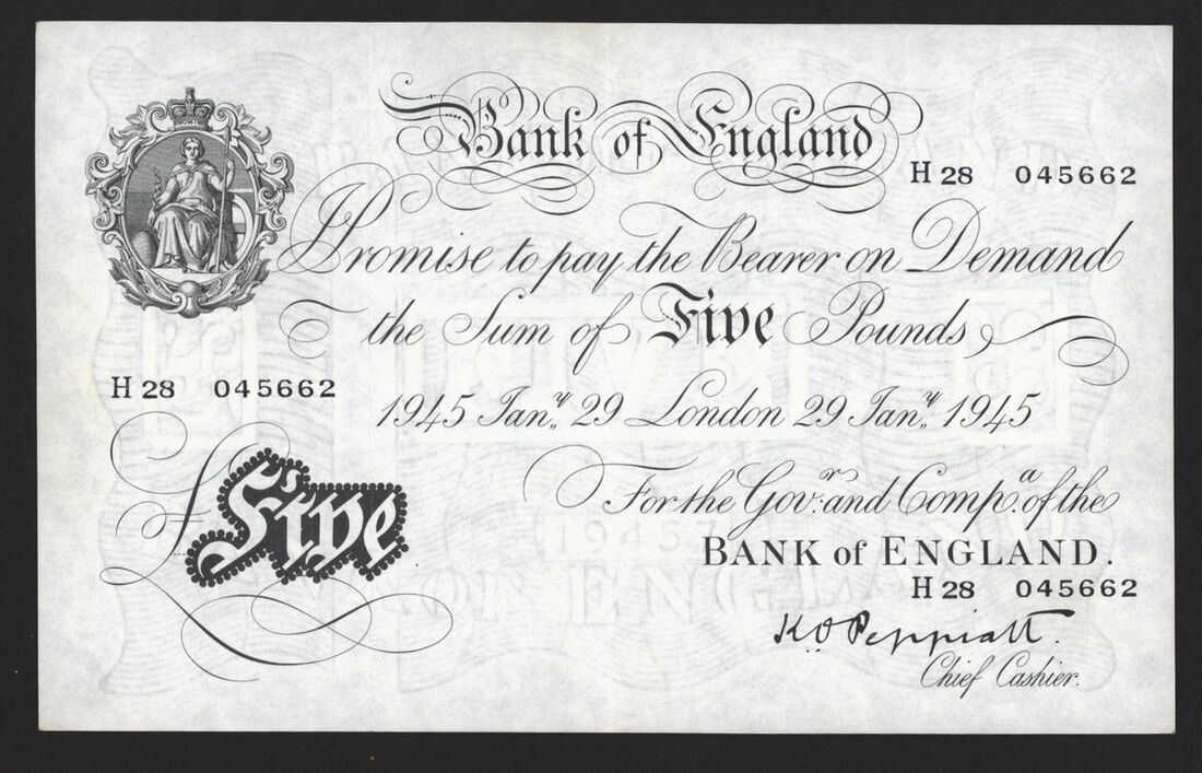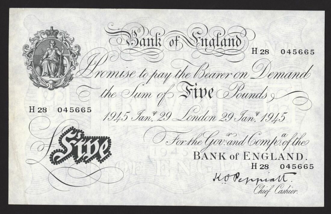Bank of England, White Note, [2 notes] £5, London, 29 January 1945, K. O. Peppiatt, thick paper, no. H28 045662, no. H28 045665