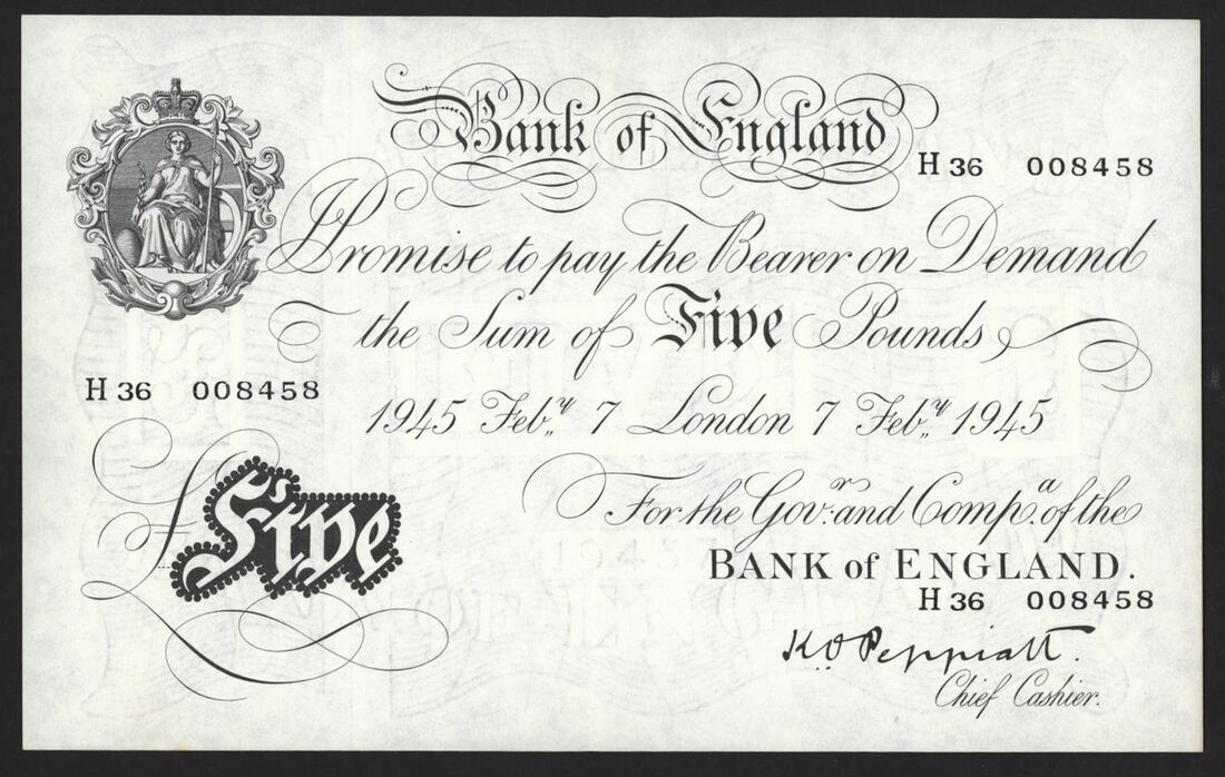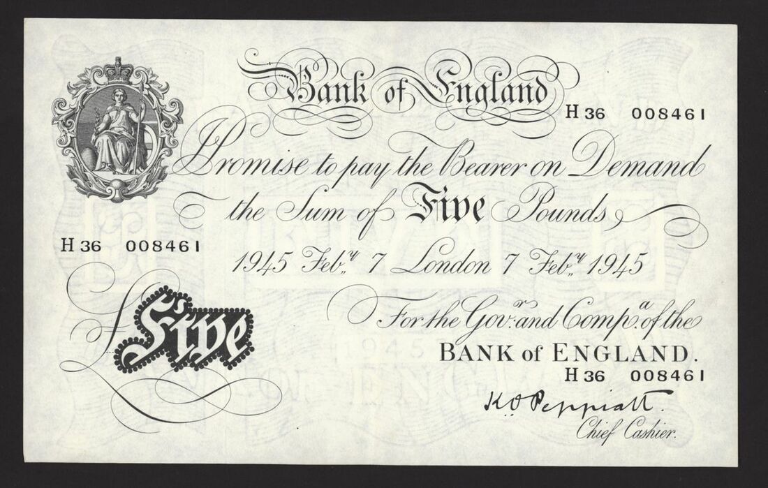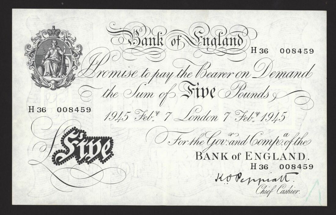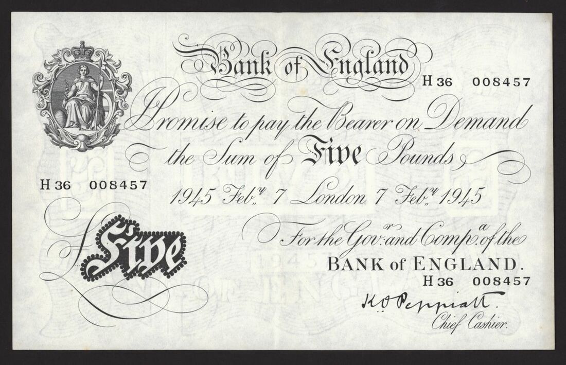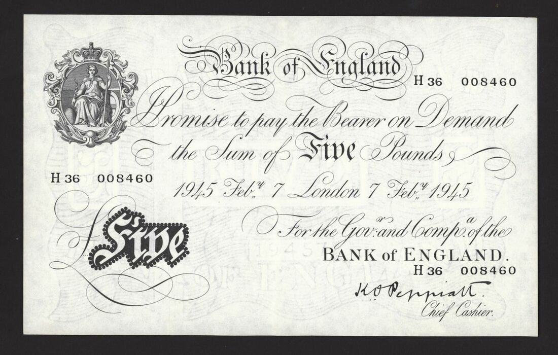 Bank of England, White Note, [5 notes] £5, London, 7 February 1945, K. O. Peppiatt, thick paper, no. H36 008457, no. H36 008458, no. H36 008459, no. H36 008460, and no. H36 008461