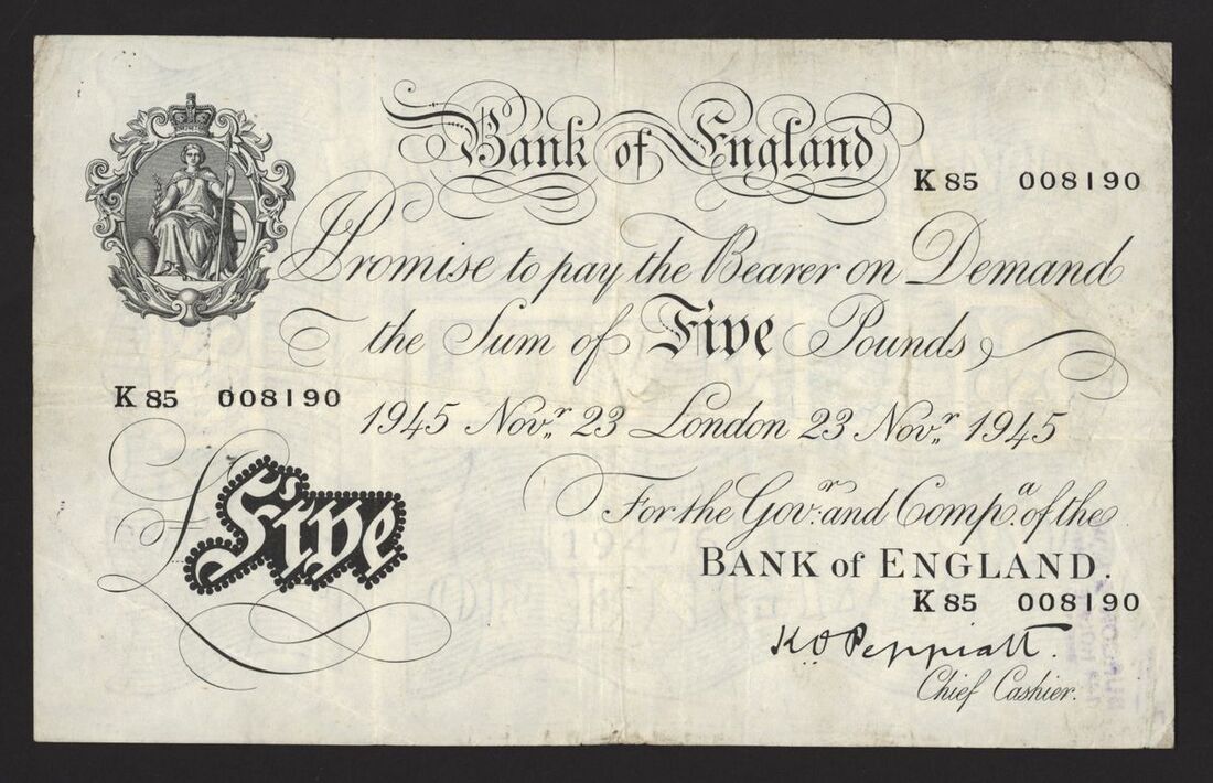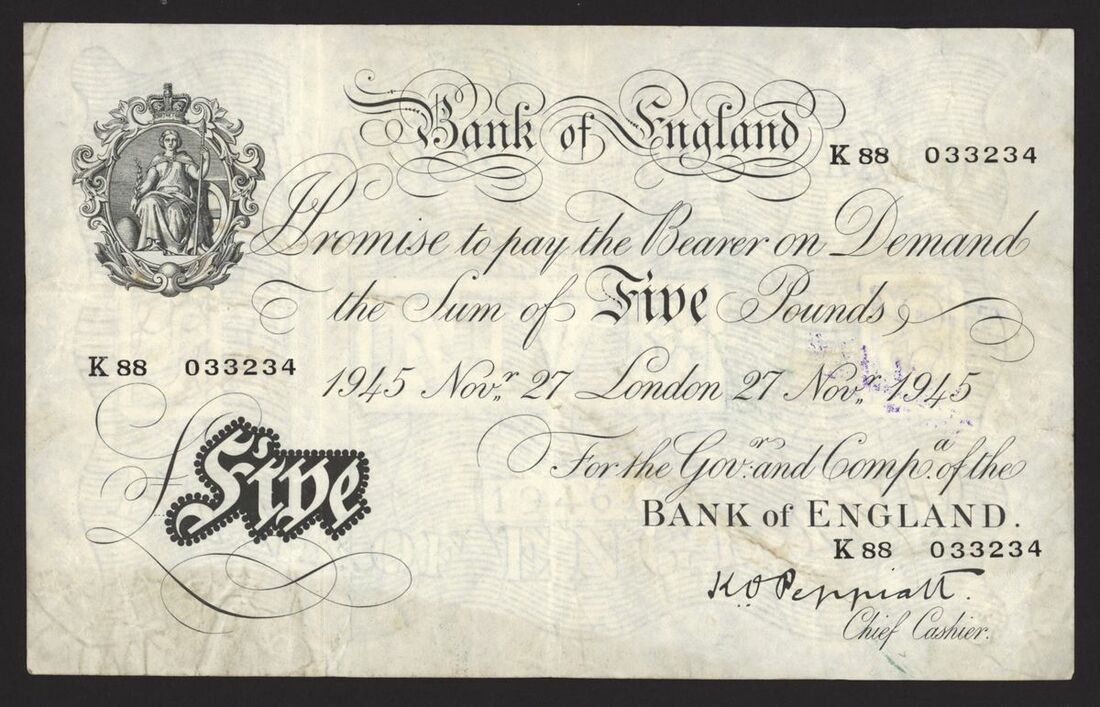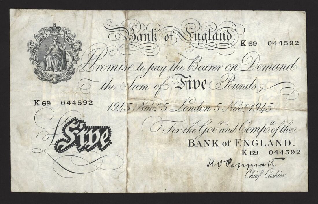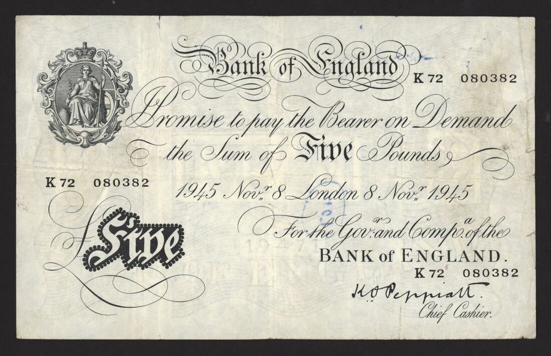 Bank of England, White Note, [5 notes] £5, London, 1945, K. O. Peppiatt, thick paper,