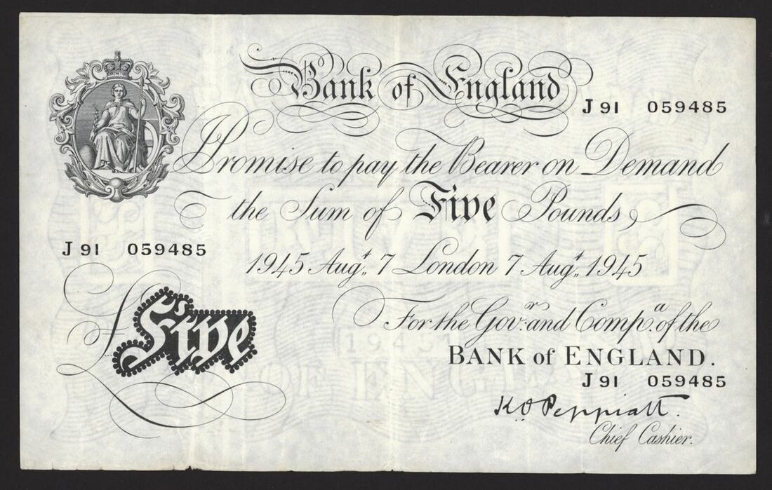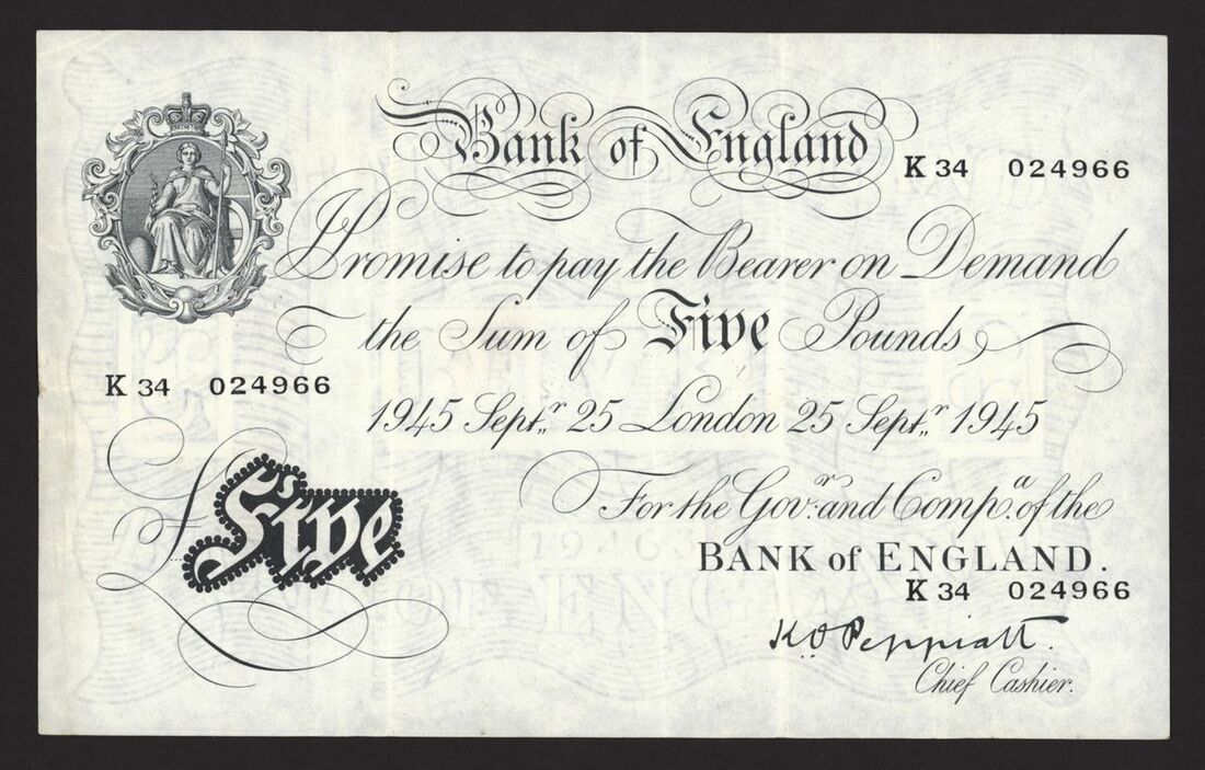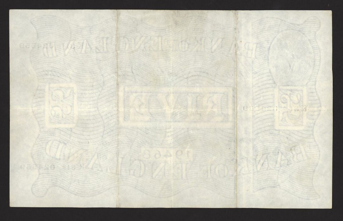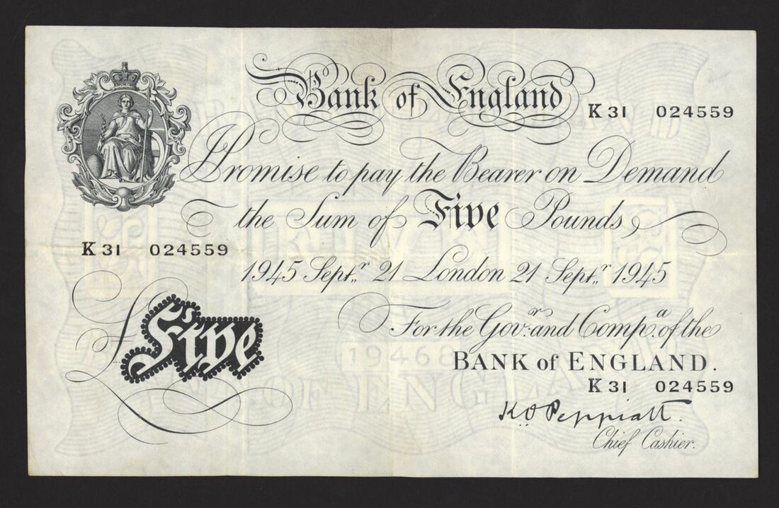 Bank of England, White Note, [4 notes] £5, London, 1945, K. O. Peppiatt, thick paper,