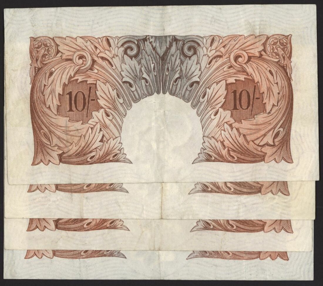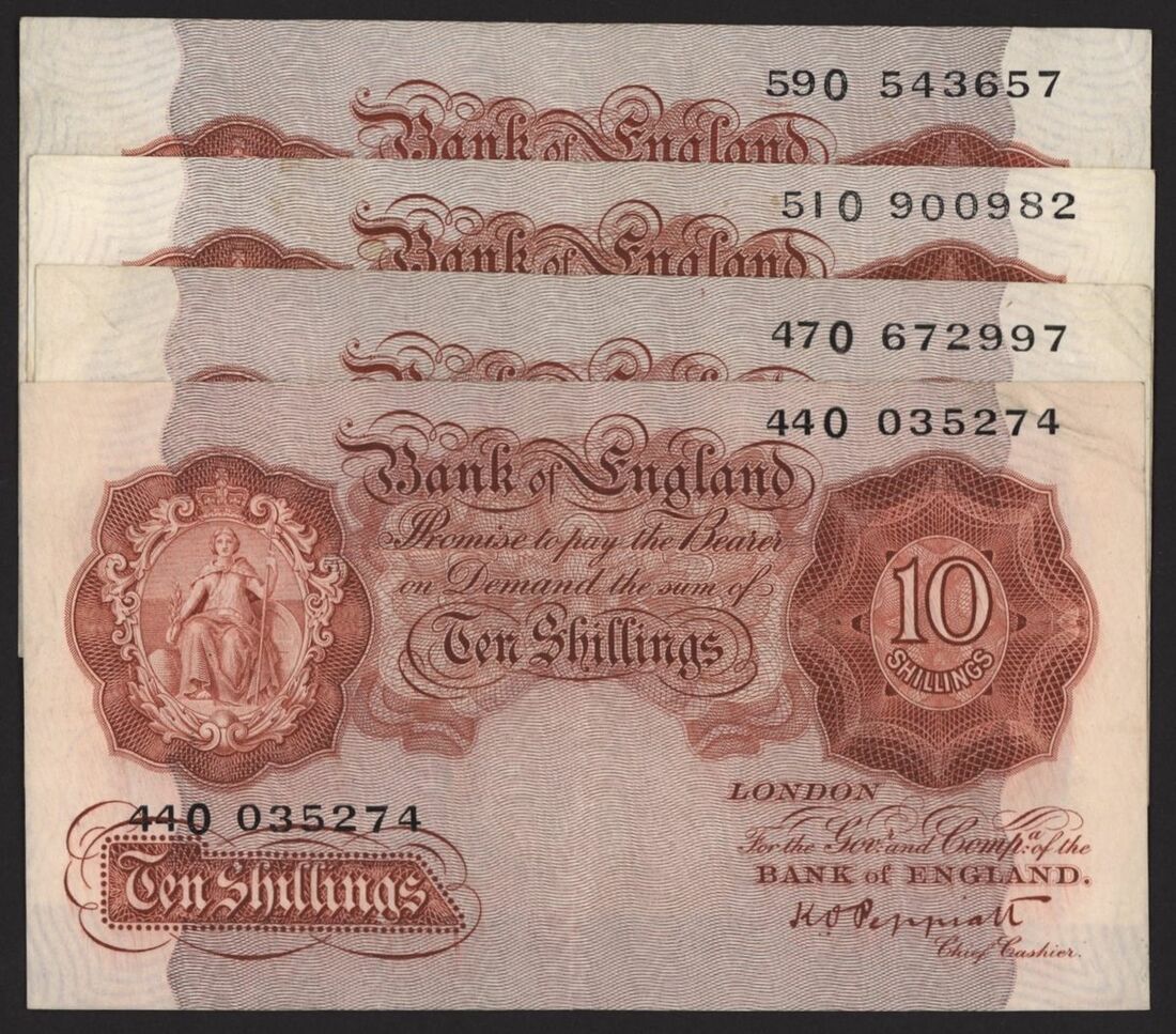 Bank of England, [4 notes] 10 Shillings, London, ND (1948), K. O. Peppiatt, unthreaded reissue, scarce first series prefixes,