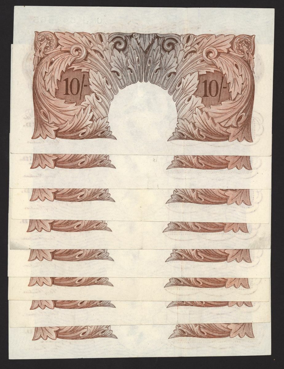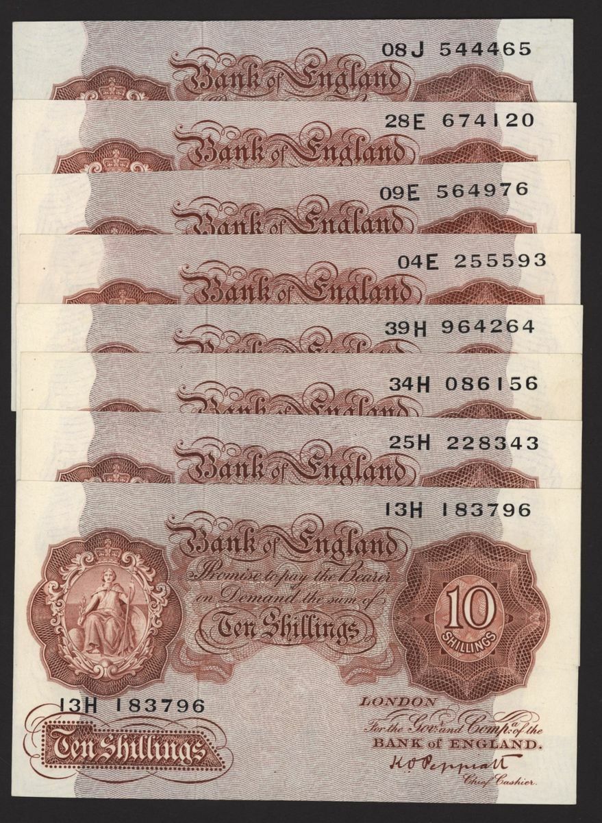 Bank of England, [8 notes] 10 Shillings, London, ND (1948), K. O. Peppiatt, threaded issue, no. 13H 183796, no. 25H 228343, no. 34H 086156, no. 39H 964264, no. 04E 255593, no. 09E 564976, no. 28E 674120, and no. 08J 544465