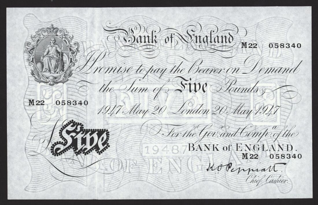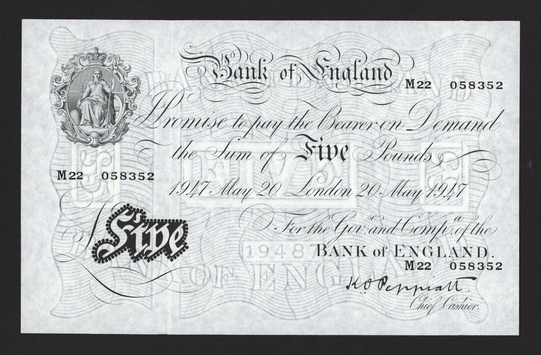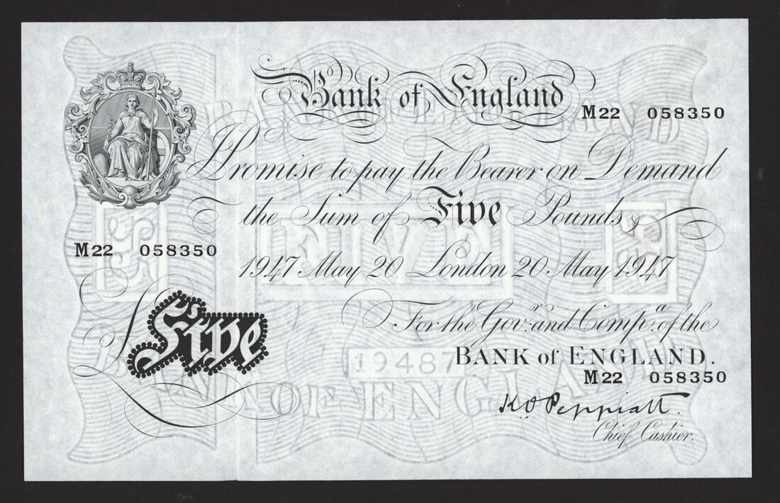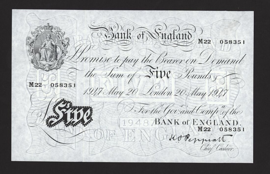 Bank of England, White Note, [4 notes] £5, London, 20 May 1947, K. O. Peppiatt, thin paper, no. M22 058340, no. M22 058350, no. M22 058351, and no. M22 058352