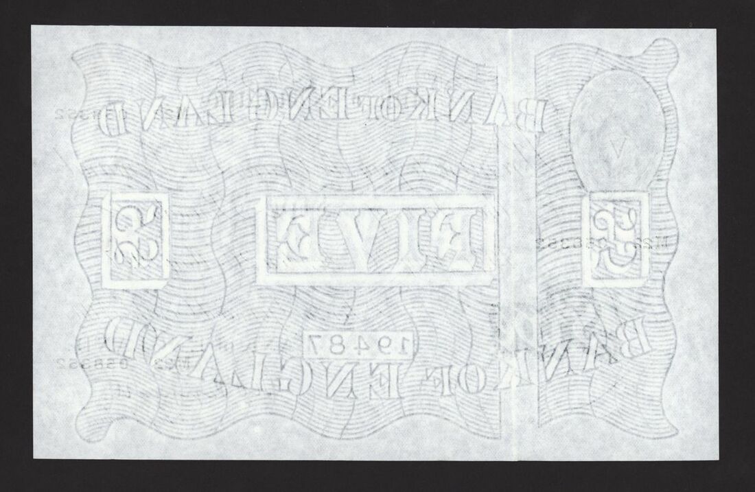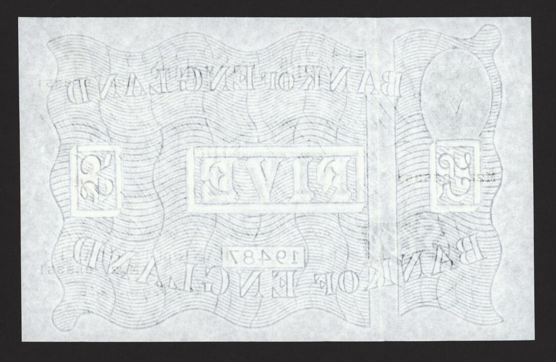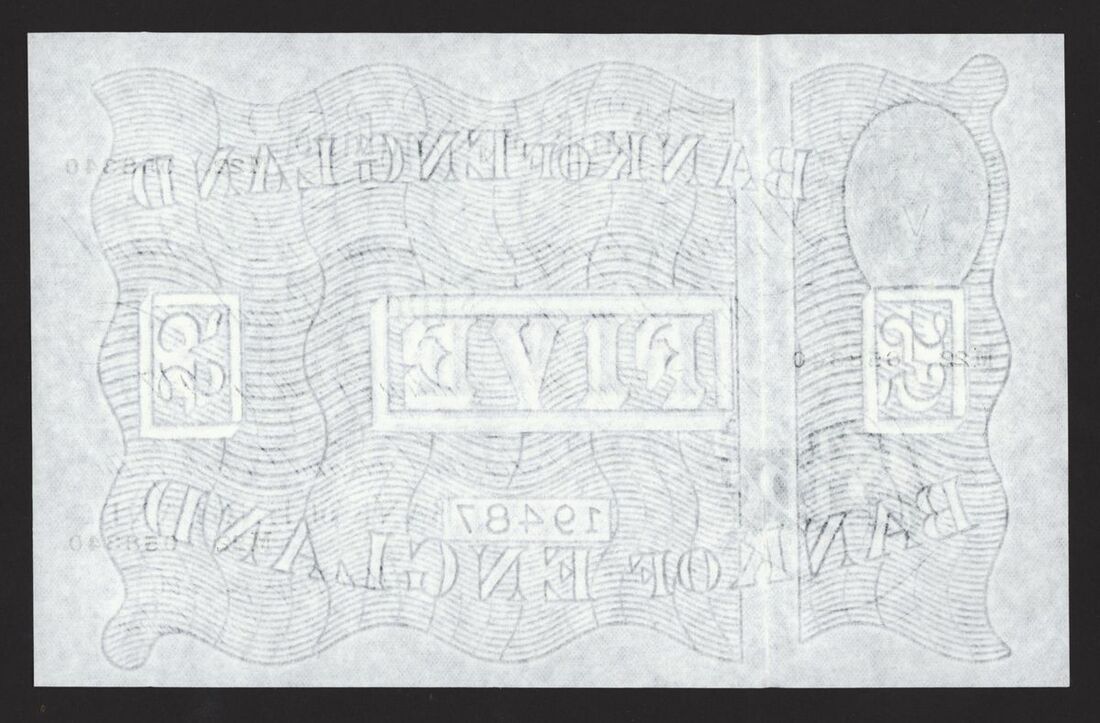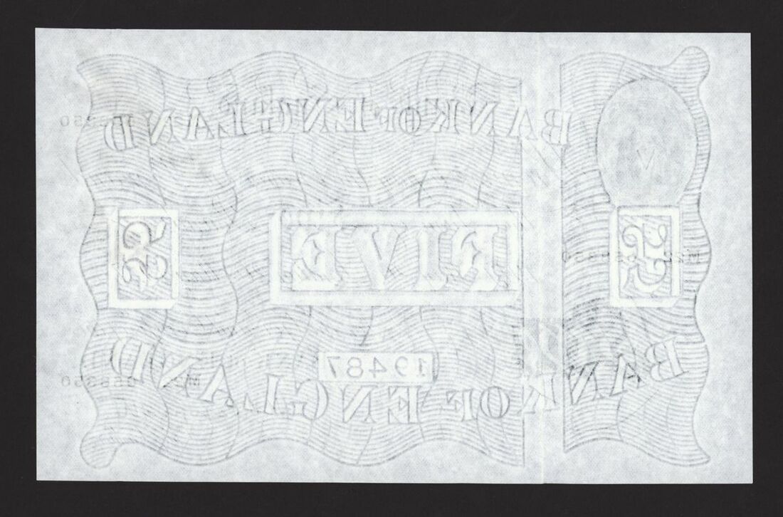Bank of England, White Note, [4 notes] £5, London, 20 May 1947, K. O. Peppiatt, thin paper, no. M22 058340, no. M22 058350, no. M22 058351, and no. M22 058352