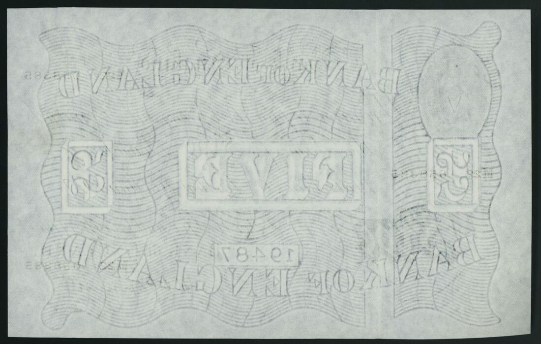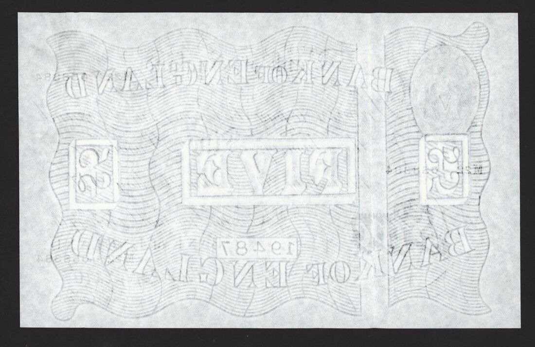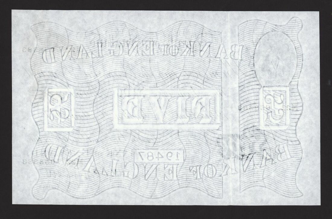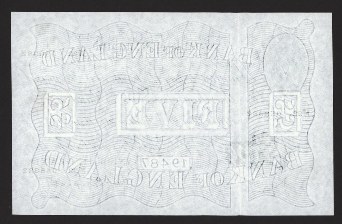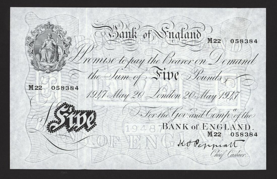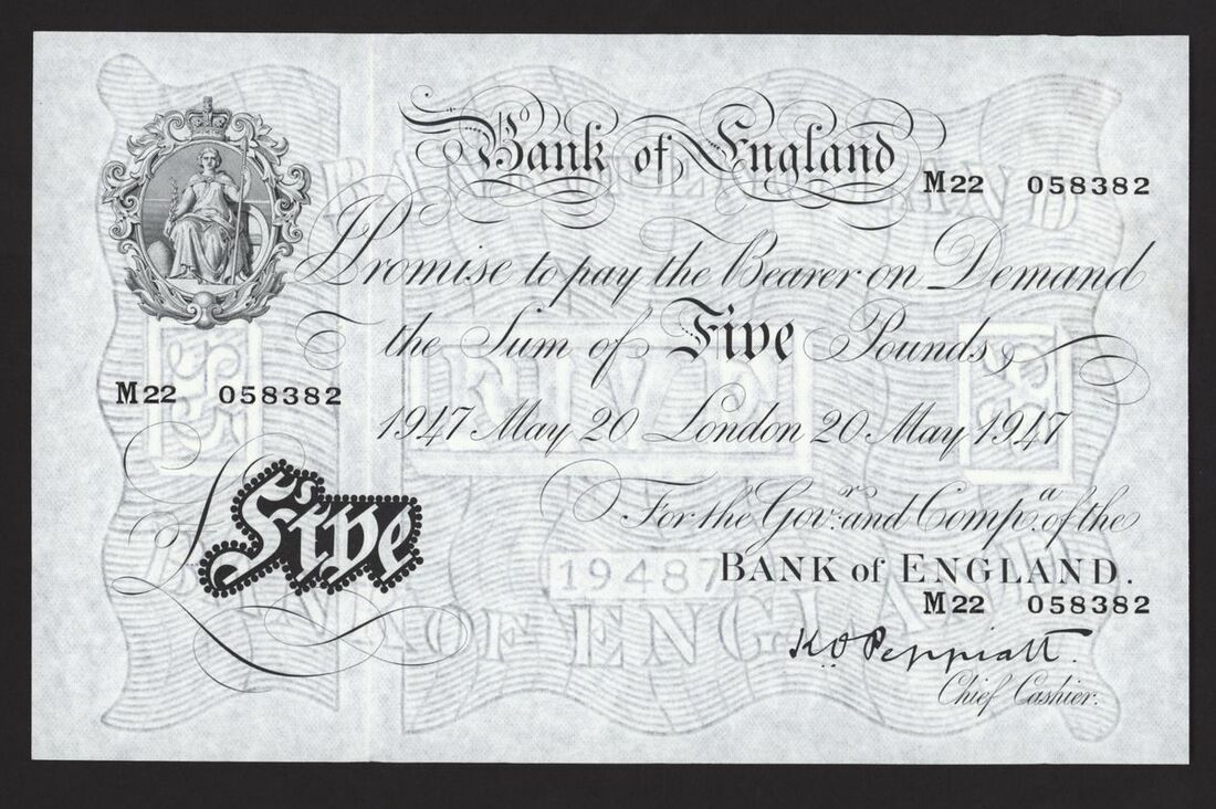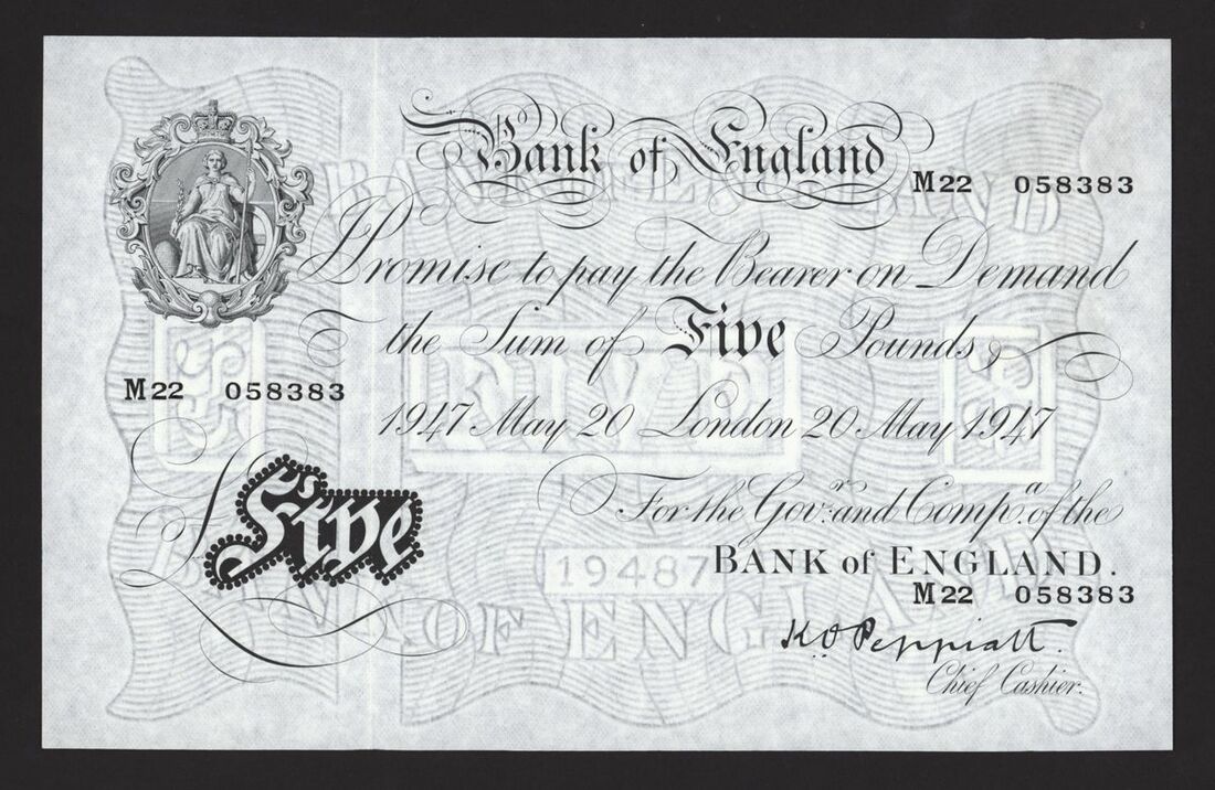Bank of England, White Note, [4 notes] £5, London, 20 May 1947, K. O. Peppiatt, thin paper, no. M22 058382, no. M22 058383, no. M22 058384, and no. M22 058385