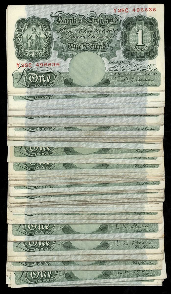 Bank of England, [100 notes] £1, London, ND (1950-1955), P. S. Beale and L. K. O'Brien, (Pick 369b, 369c, EPM B268, B273), fine to very fine (100 notes)