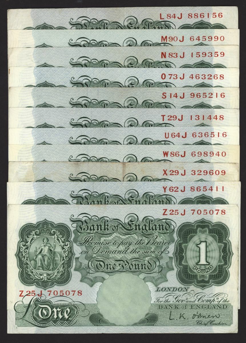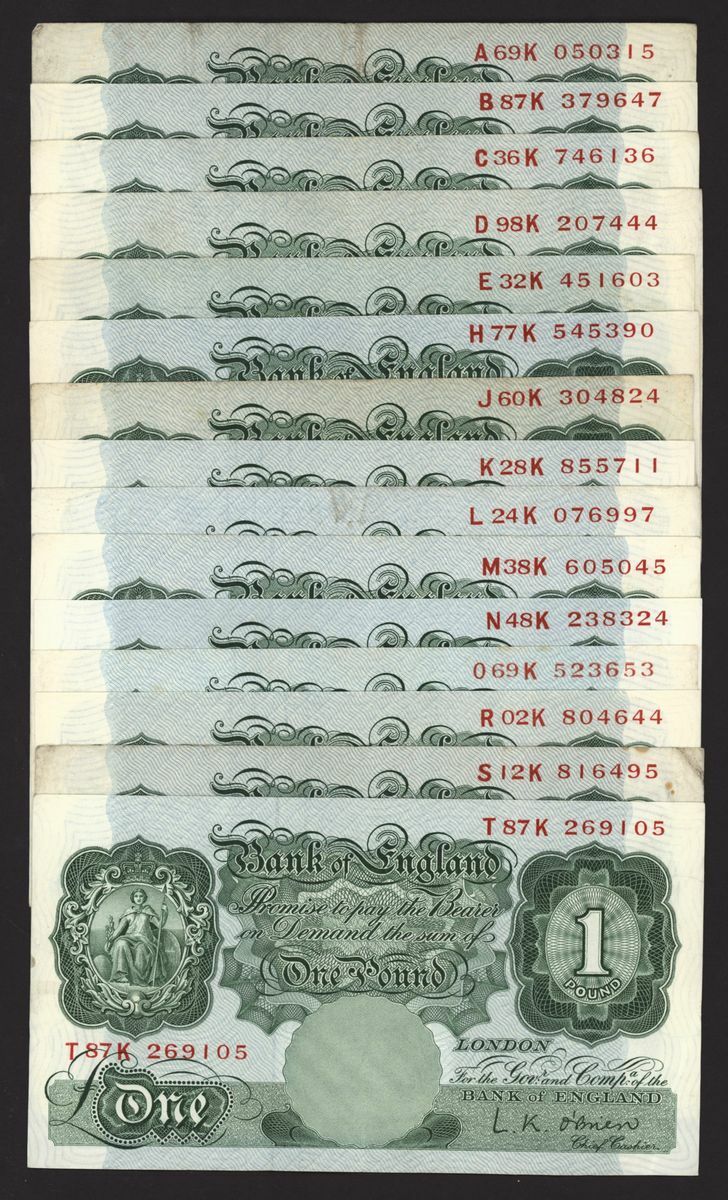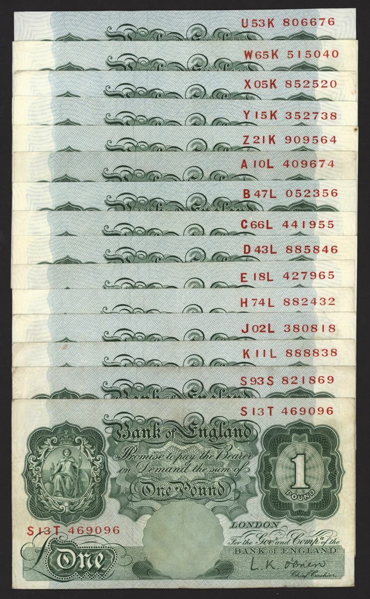 Bank of England, [43 notes] £1, London, ND (1955), L. K. O'Brien, full set (less RJ) prefixes first series LJ to ZJ, AK to ZK, AL to last series KL, plus replacements S93S and S31T