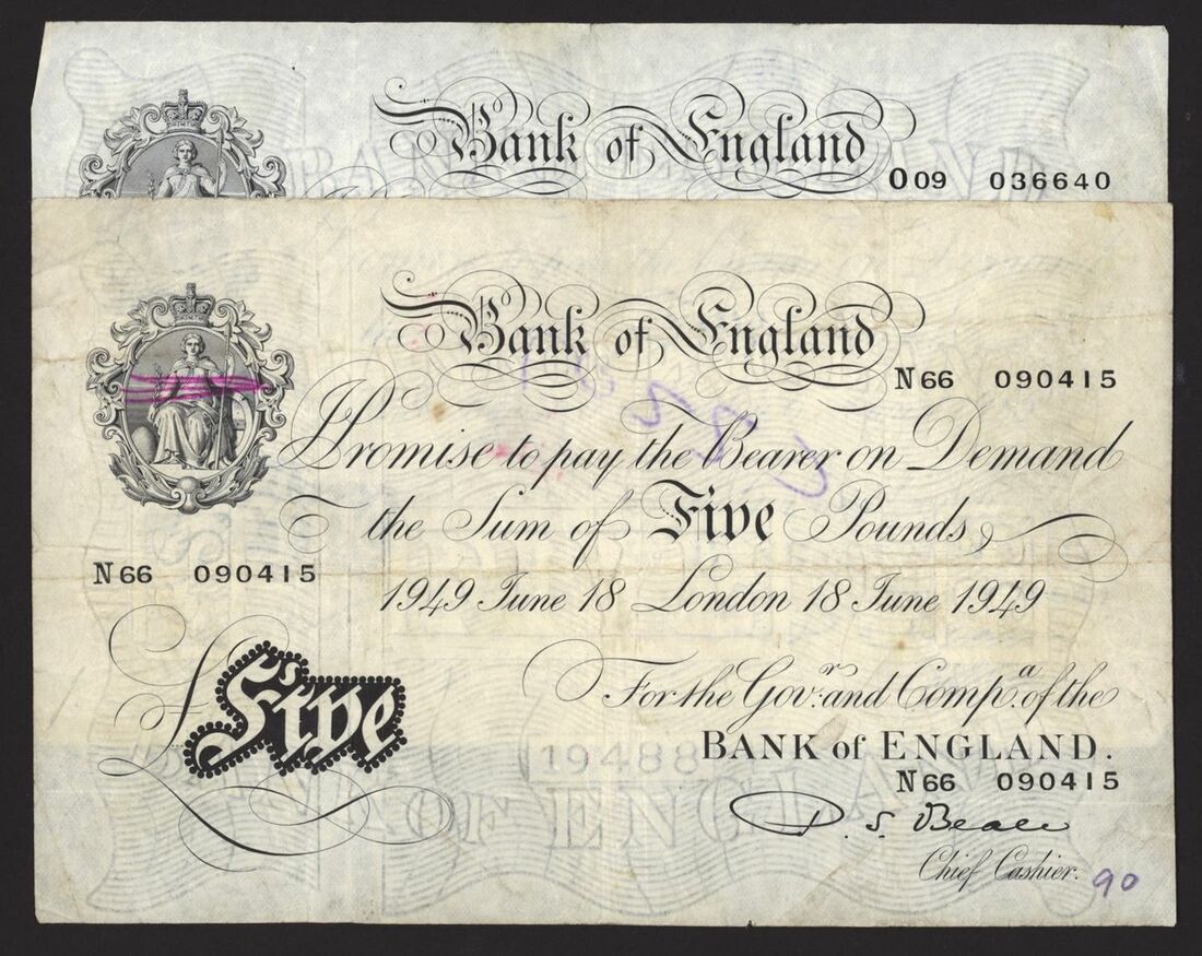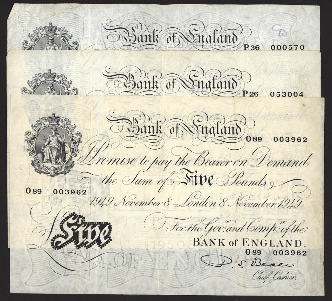 Bank of England, White Note, [5 notes] £5, London, 1949, P. S. Beale,