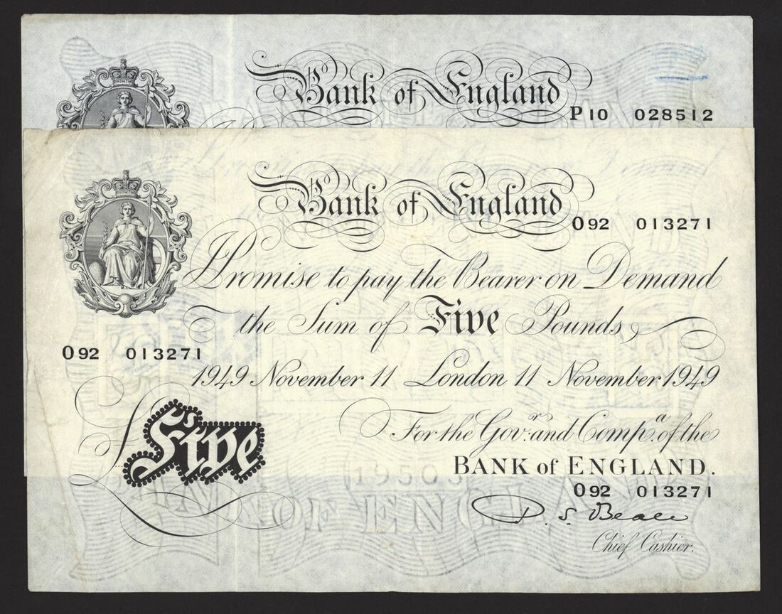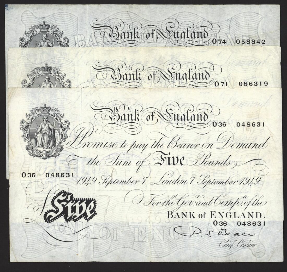 Bank of England, White Note, [5 notes] £5, London, 1949, P. S. Beale,