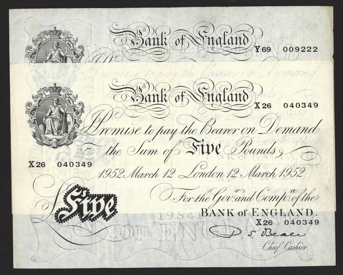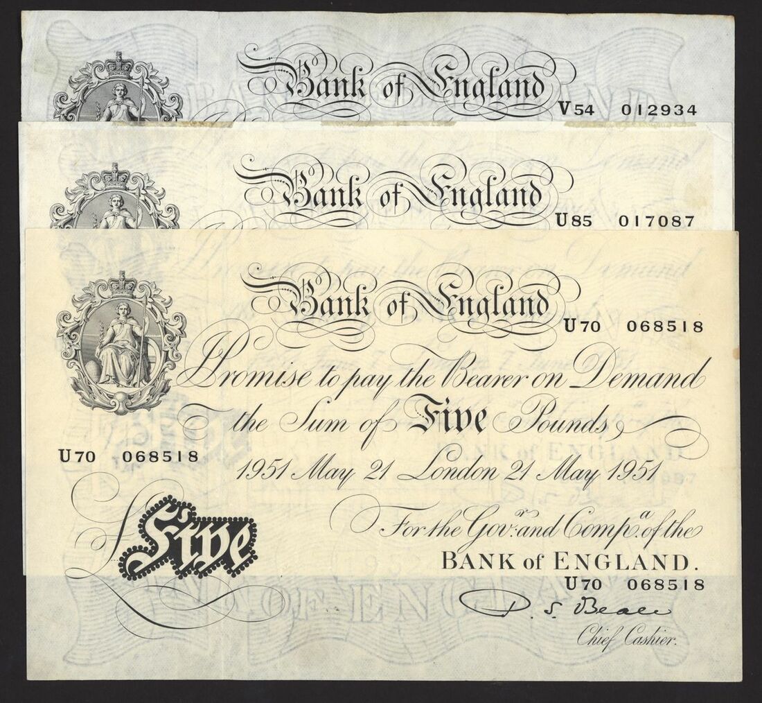 Bank of England, White Note, [5 notes] £5, London, 1951-1952, P. S. Beale,
