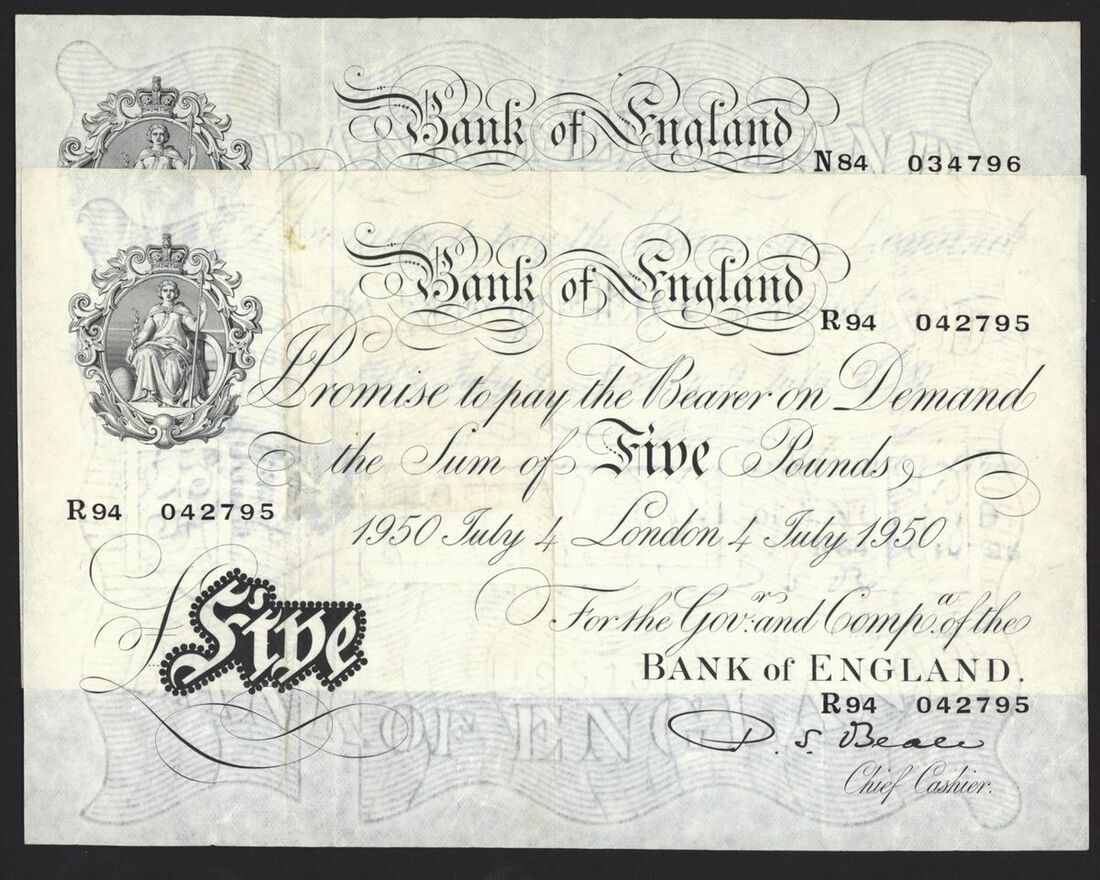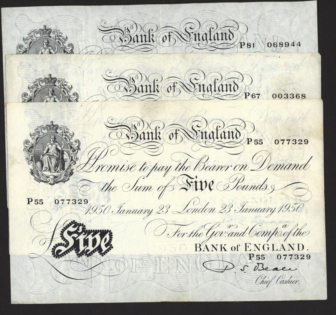 Bank of England, White Note, [5 notes] £5, London, 1949-1950, P. S. Beale,