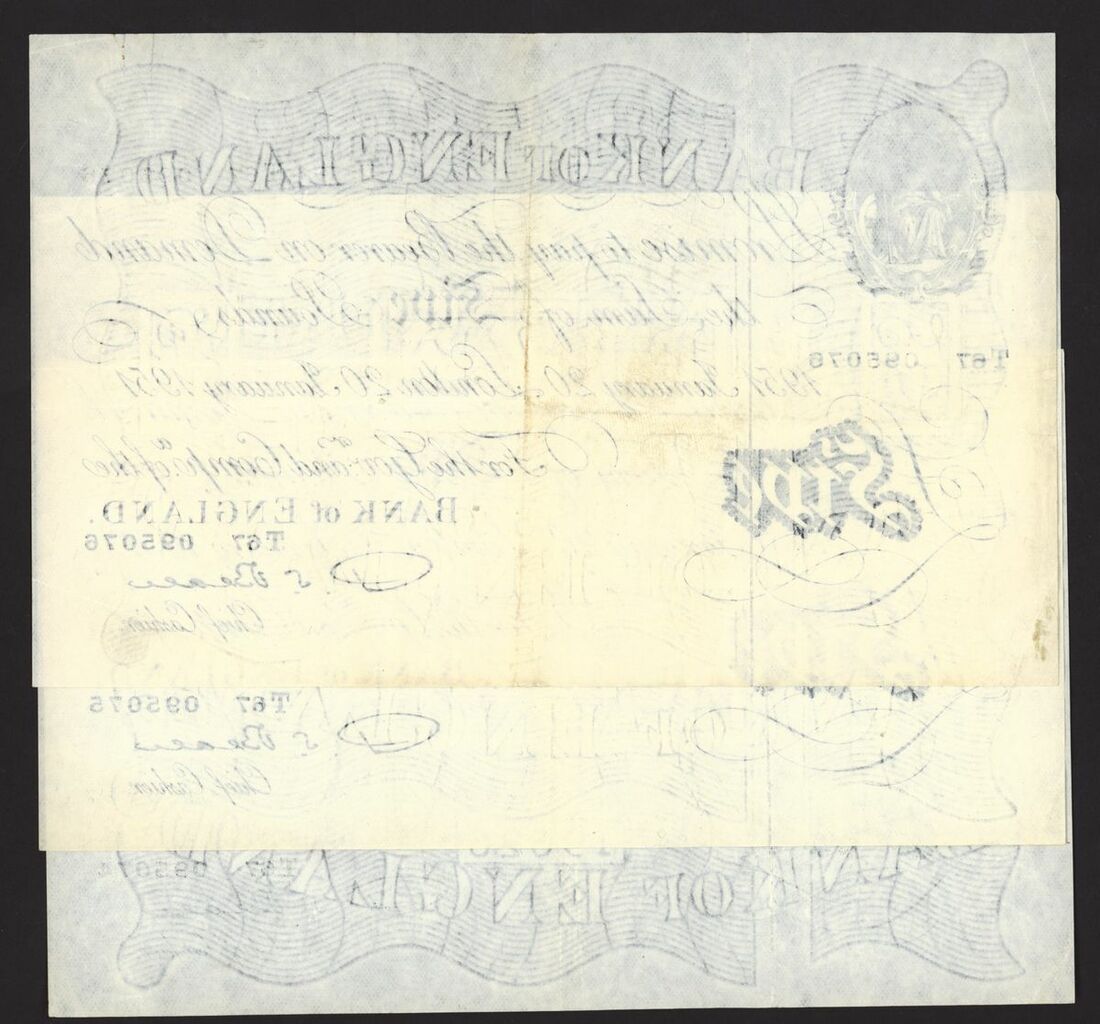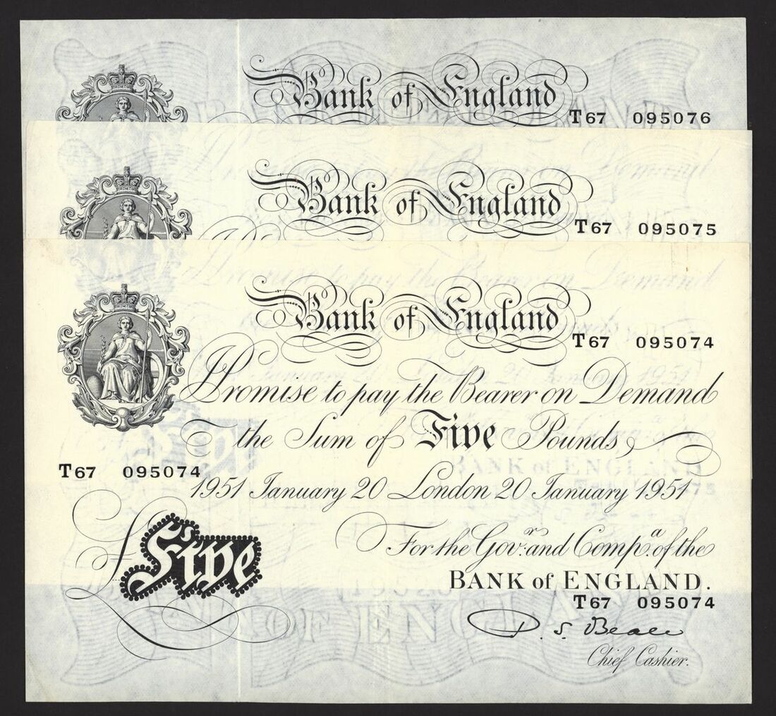 Bank of England, White Note, [3 notes] £5, London, 20 January 1951, P. S. Beale, no. T67 095074, no. T67 095075, and no. T67 095076