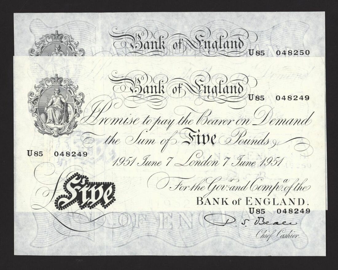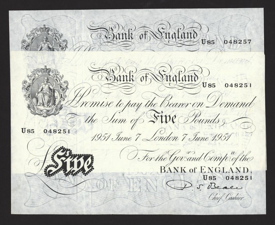 Bank of England, White Note, [4 notes] £5, London, 7 June 1951, P. S. Beale, no. U85 048249, no. U85 048250, no. U85 048251, and no. U85 048257