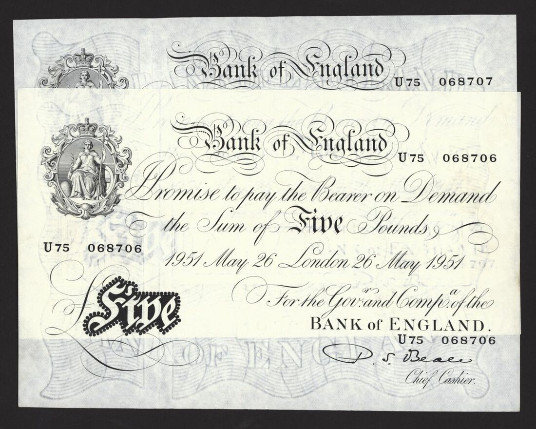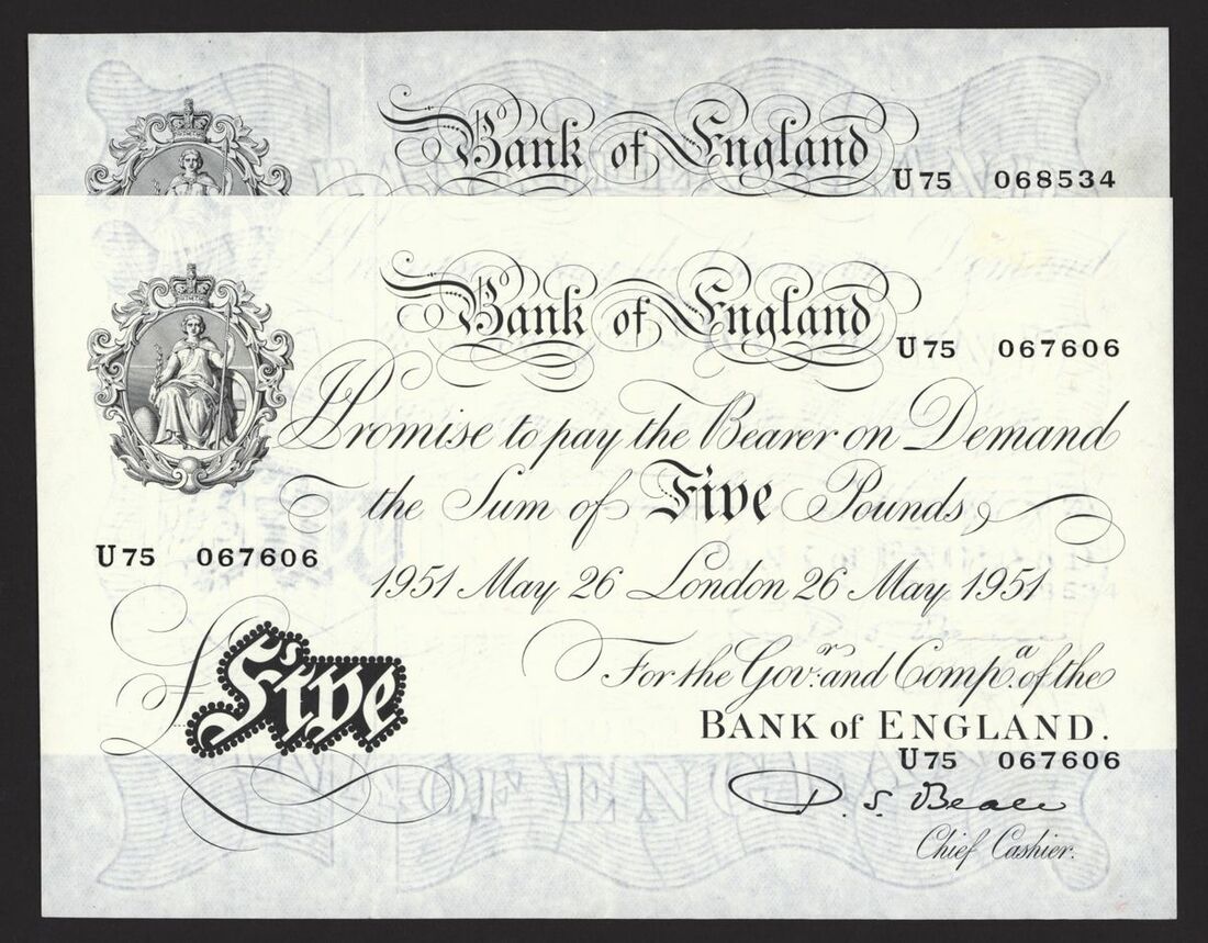 Bank of England, White Note, [4 notes] £5, London, 26 May 1951, P. S. Beale, no. U75 067606, no. U75 068534, no. U75 068706, and no. U75 068707