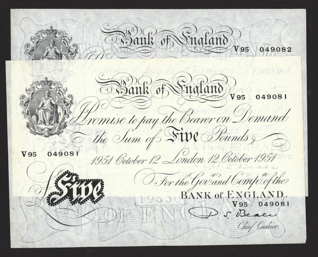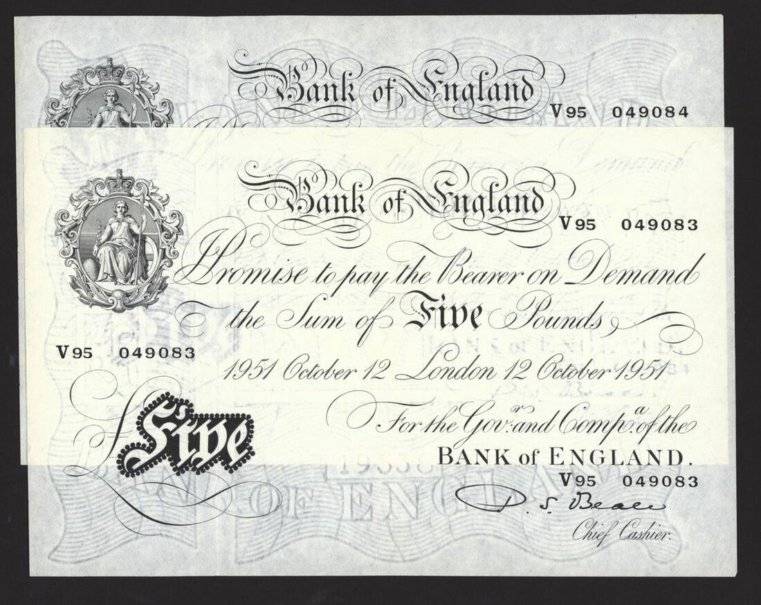 Bank of England, White Note, [4 notes] £5, London, 12 October 1951, P. S. Beale, no. V95 049081, no. V95 049082, no. V95 049083, and no. V95 049084