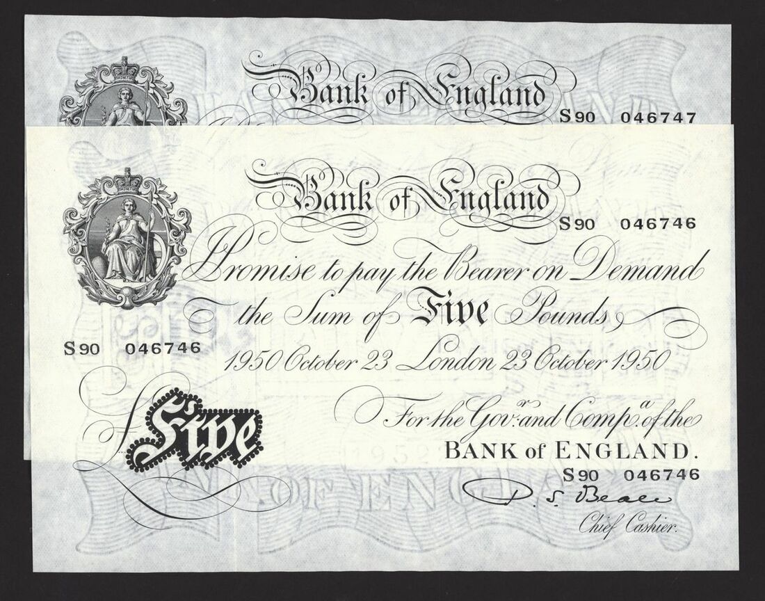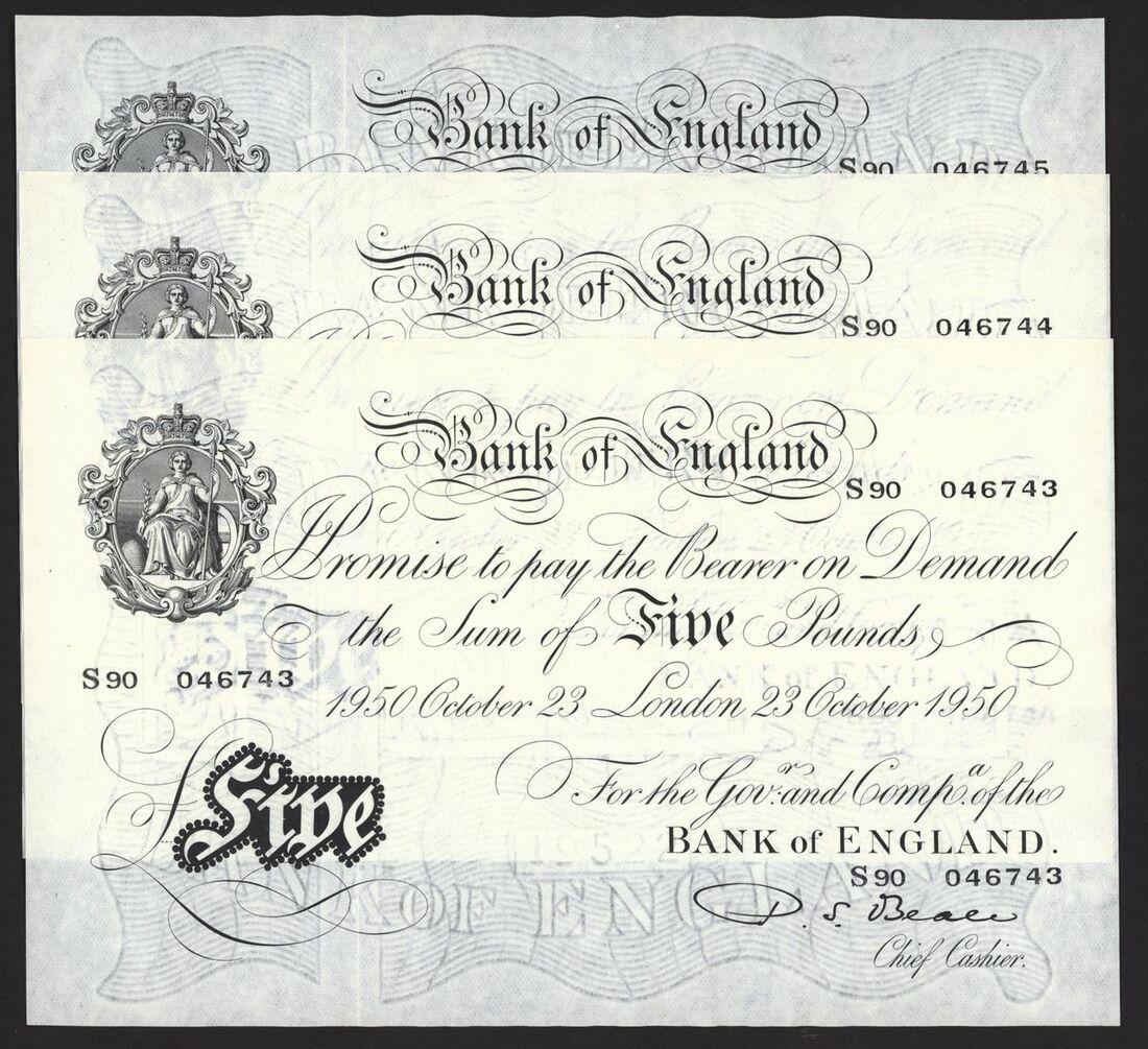 Bank of England, White Note, [5 notes] £5, London, 23 October 1950, P. S. Beale, no. S90 046743, no. S90 046744, no. S90 046745, no. S90 046746, and no. S90 046747