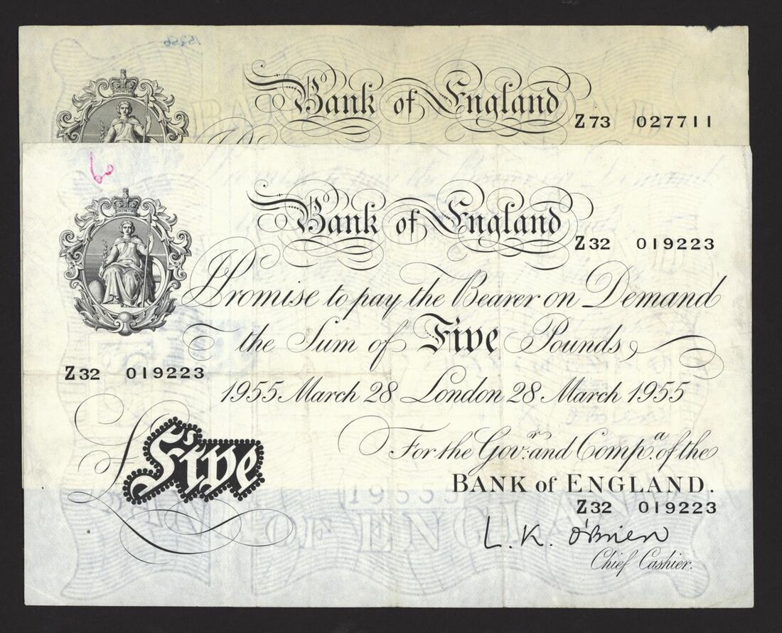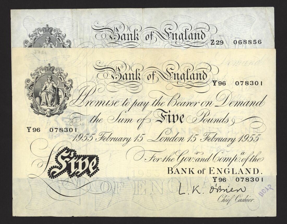 Bank of England, White Note, [4 notes] £5, London, 1955, L. K. O'Brien,