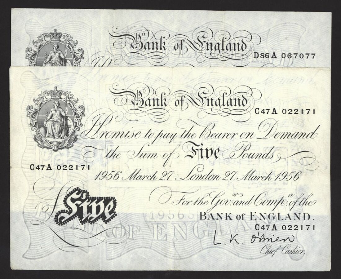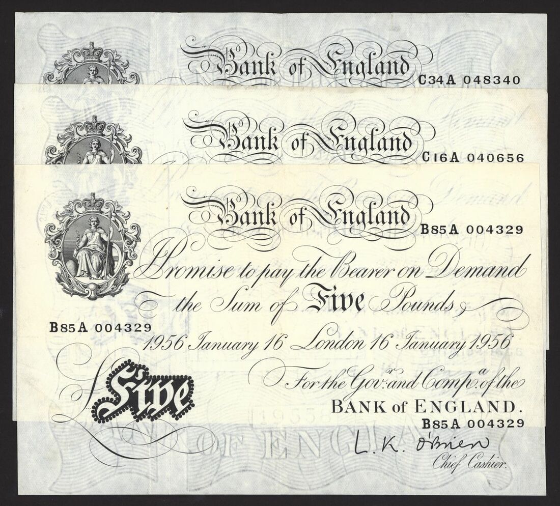 Bank of England, White Note, [5 notes] £5, London, 1956, L. K. O'Brien,