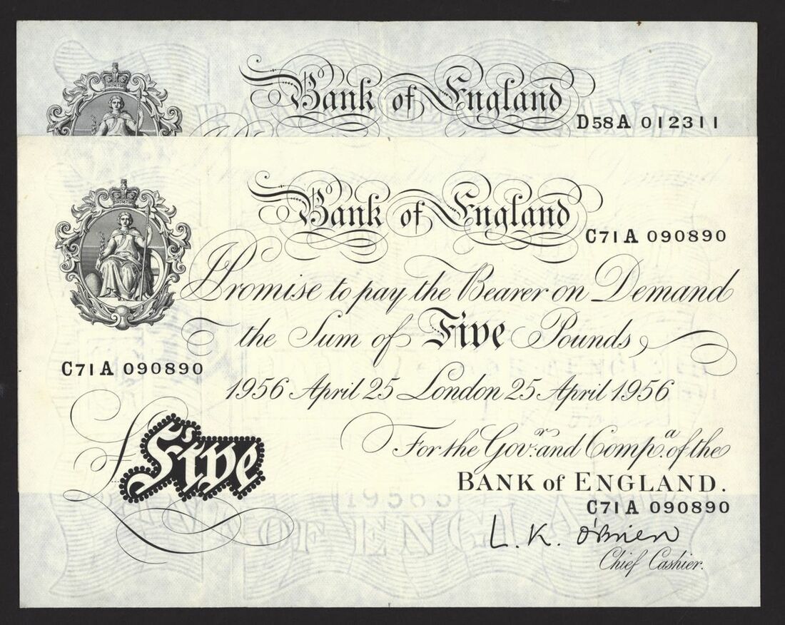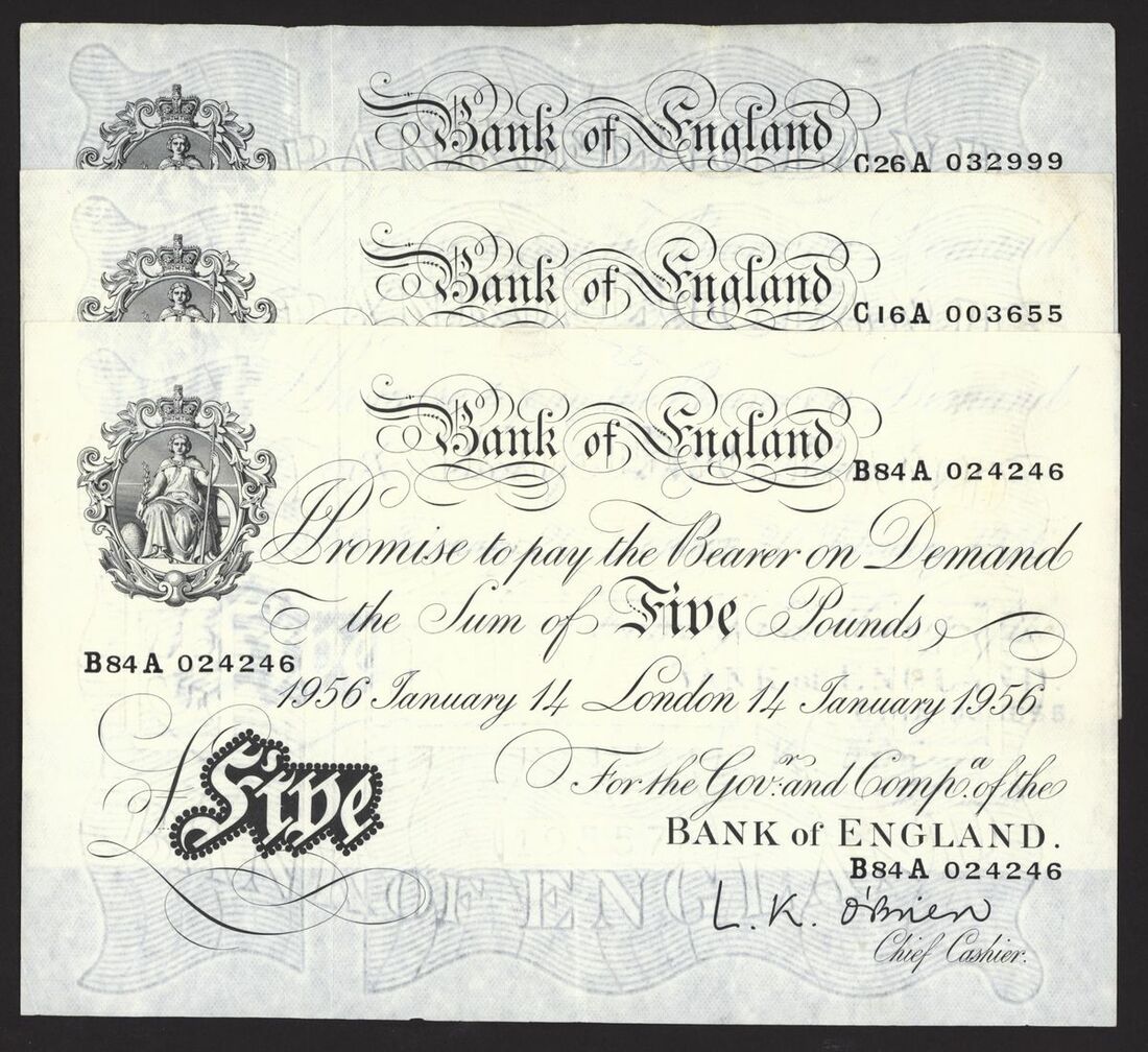 Bank of England, White Note, [5 notes] £5, London, 1956, L. K. O'Brien,