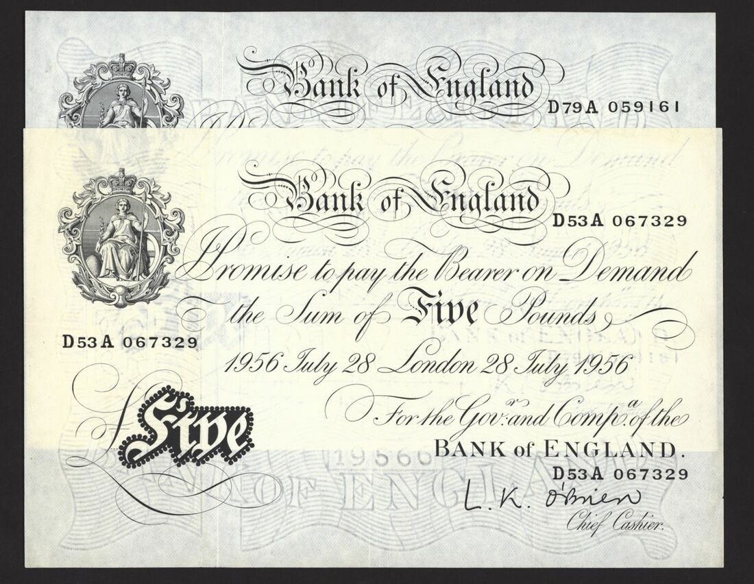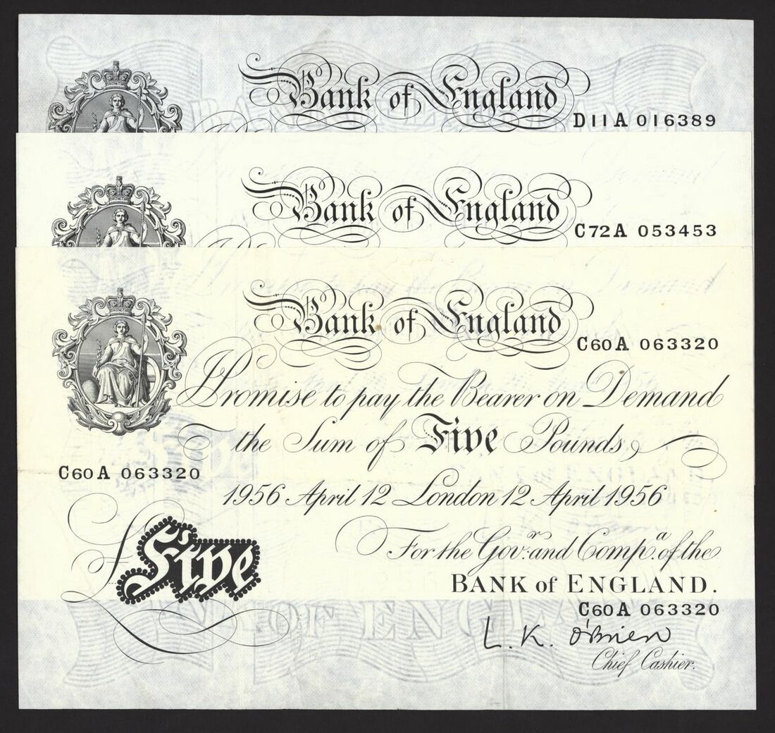 Bank of England, White Note, [5 notes] £5, London, 1956, L. K. O'Brien,