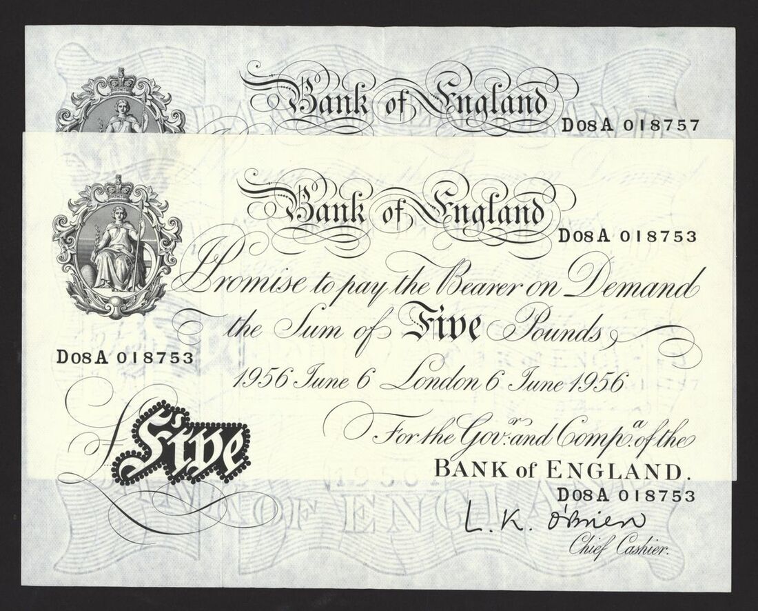 Bank of England, White Note, [2 notes] £5, London, 6 June 1956, L. K. O'Brien, no. D08A 018753, no. D08A 018757