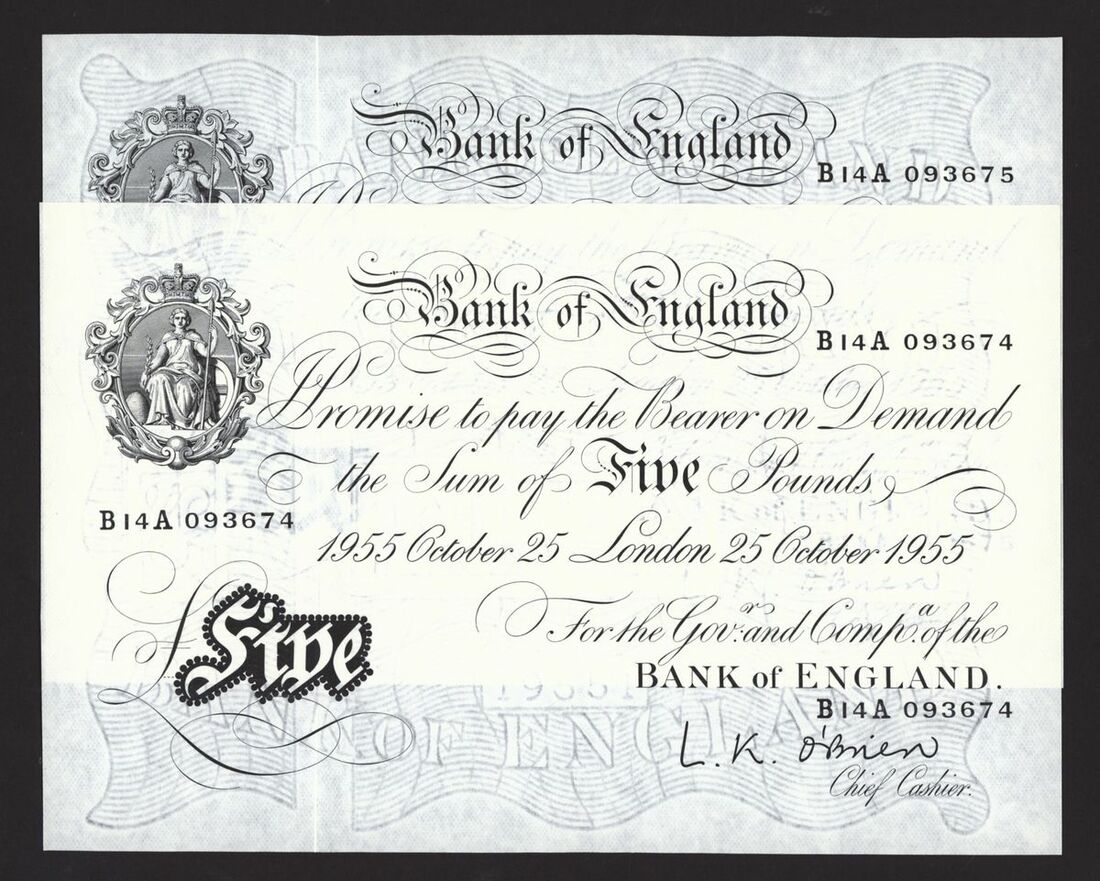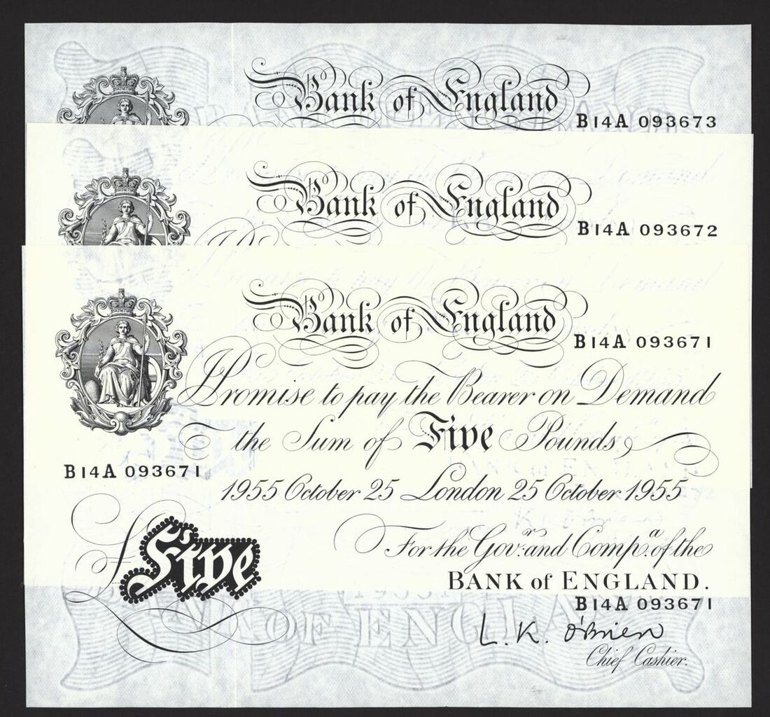 Bank of England, White Note, [5 notes] £5, London, 25 October 1955, L. K. O'Brien, consecutive nos. B14A 093671-093675