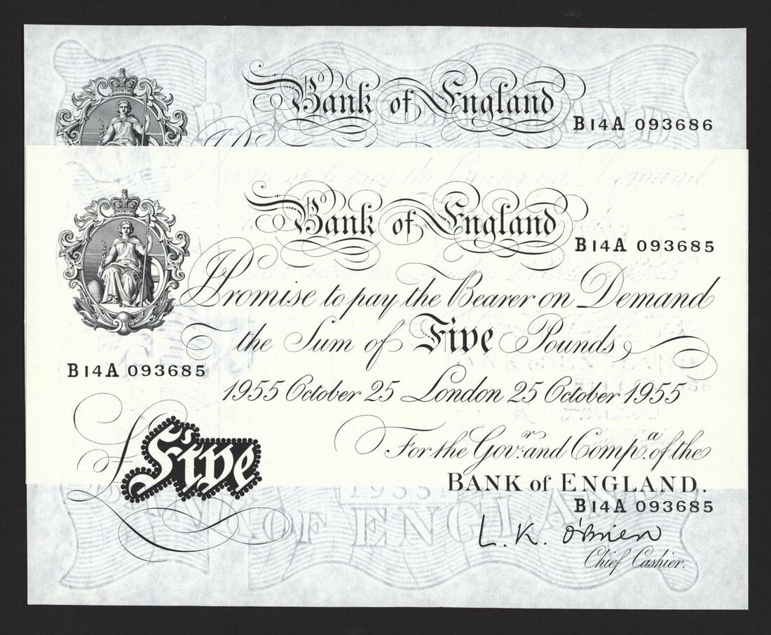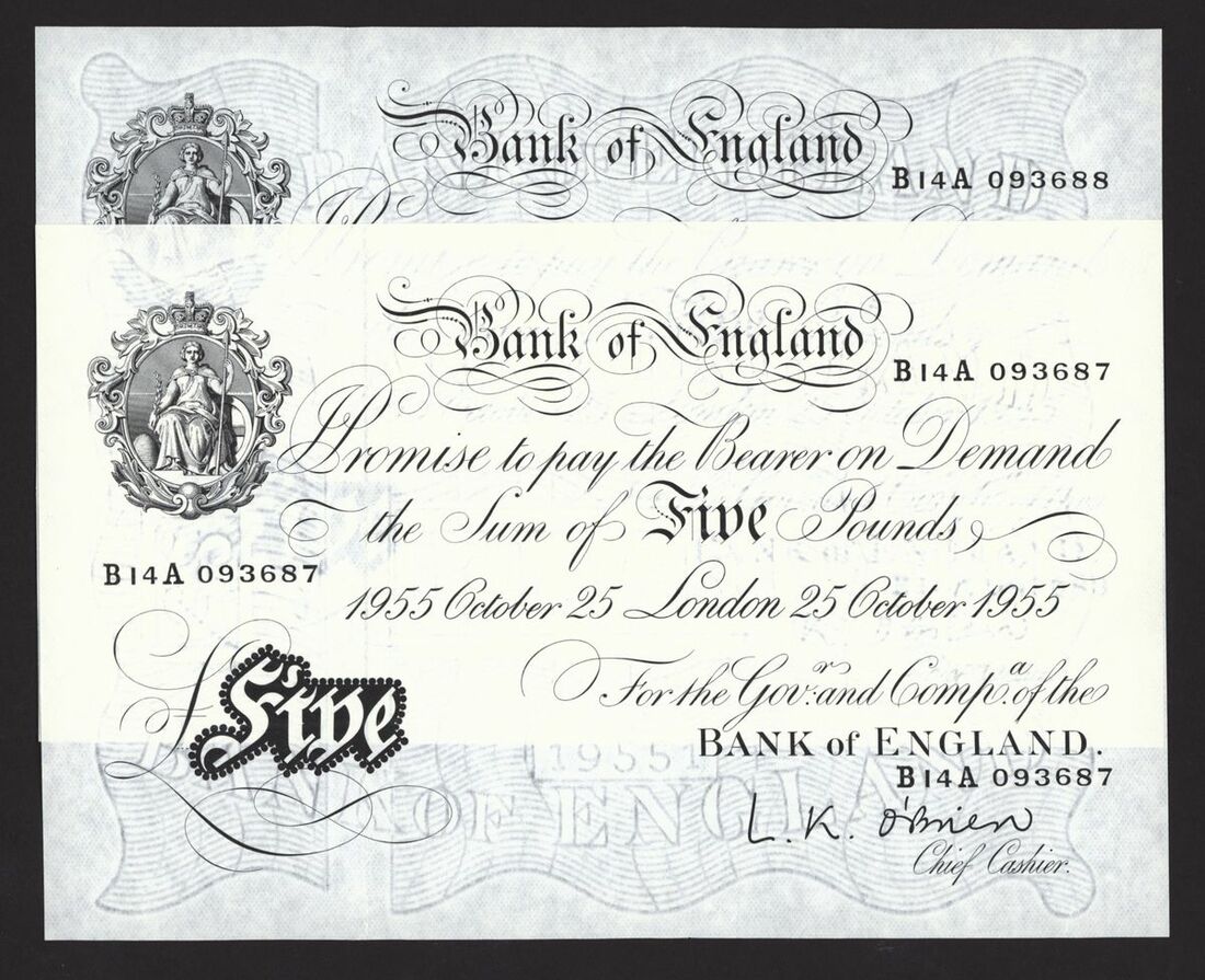 Bank of England, White Note, [4 notes] £5, London, 25 October 1955, L. K. O'Brien, consecutive nos. B14A 093685-093688