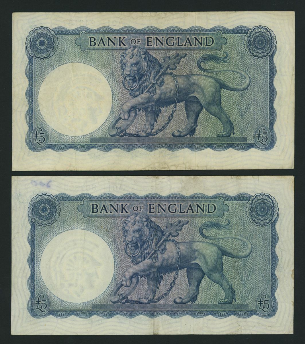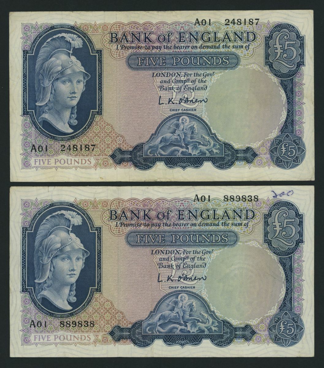 Bank of England, [2 notes] £5, London, ND (1957), L. K. O'Brien, first run,