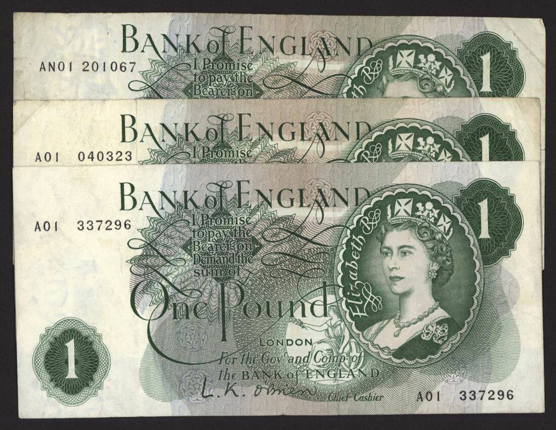 Bank of England, [3 notes] £1, London, ND (1960-1970), L. K. O'Brien and J. B. Page, no. A01 337296, no. A01 040323, and no. AN01 201067
