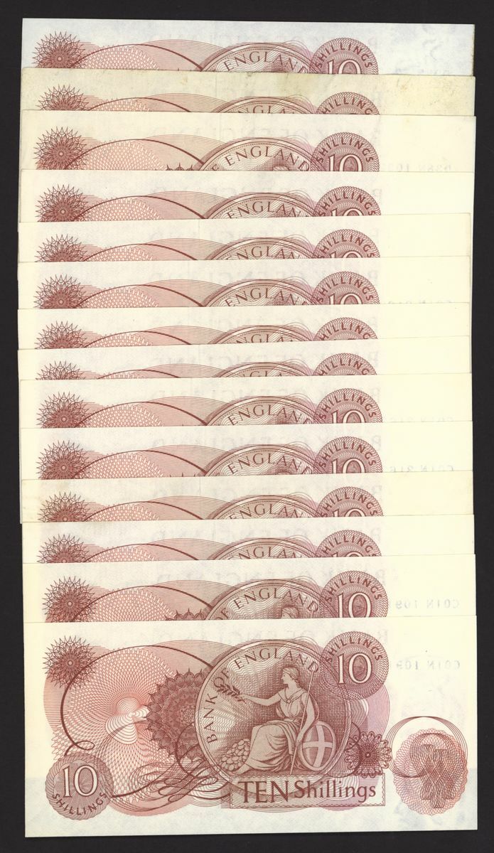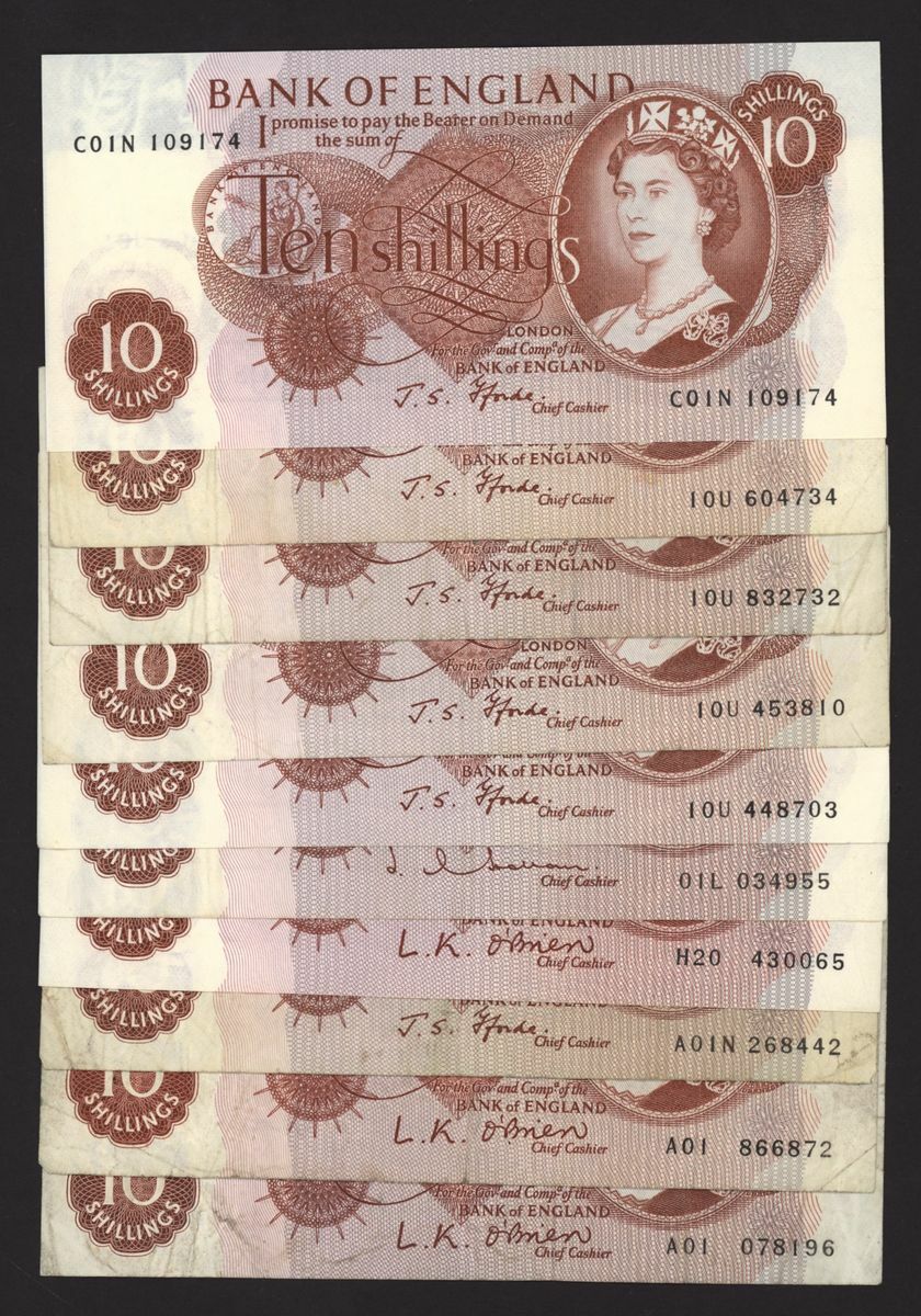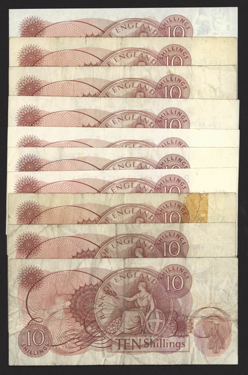 Bank of England, [25 notes] 10 Shillings, London, ND (1961-70), O'Brien, Hollom, and Fforde, selected first and last prefixes A01 (2), D38N (3), plus 10U (4), C01N (12, including consecutives), 01L, H20