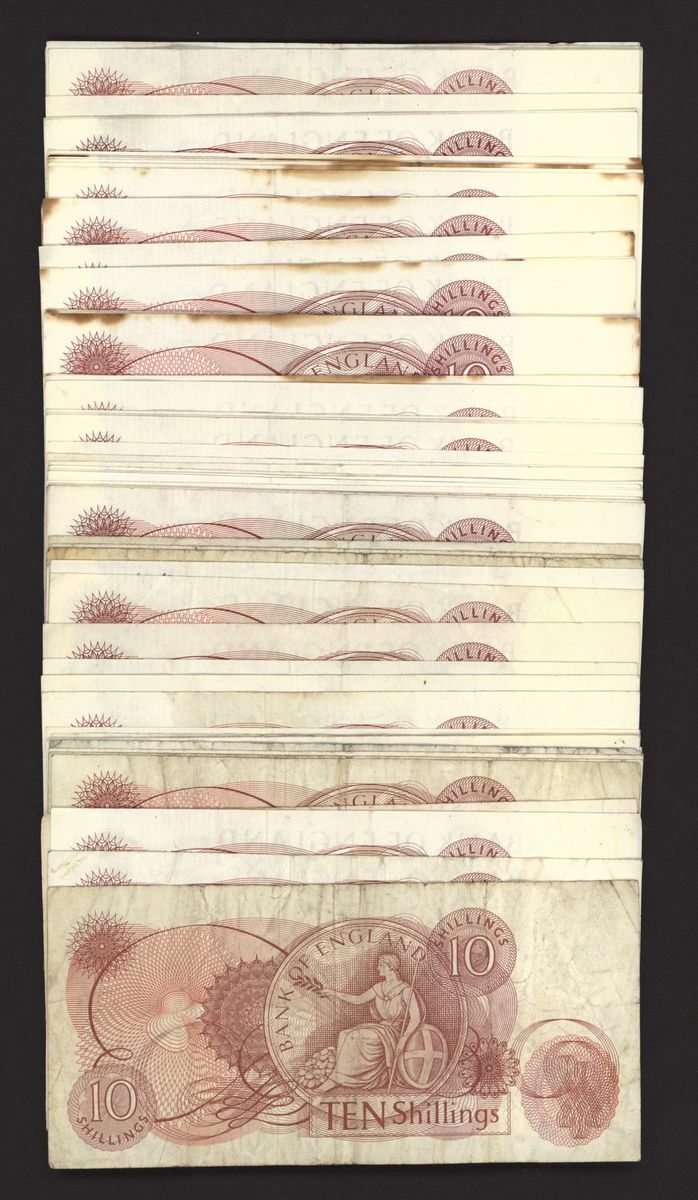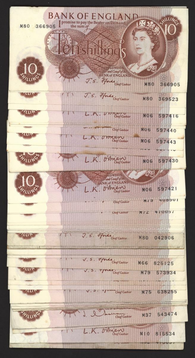 Bank of England, [79 notes] 10 Shillings, London, ND (1961-70), O'Brien, Hollom, and Fforde, replacement issues, includes consecutive run M06 (22) and last prefix M80 (7)