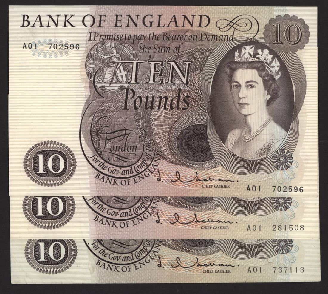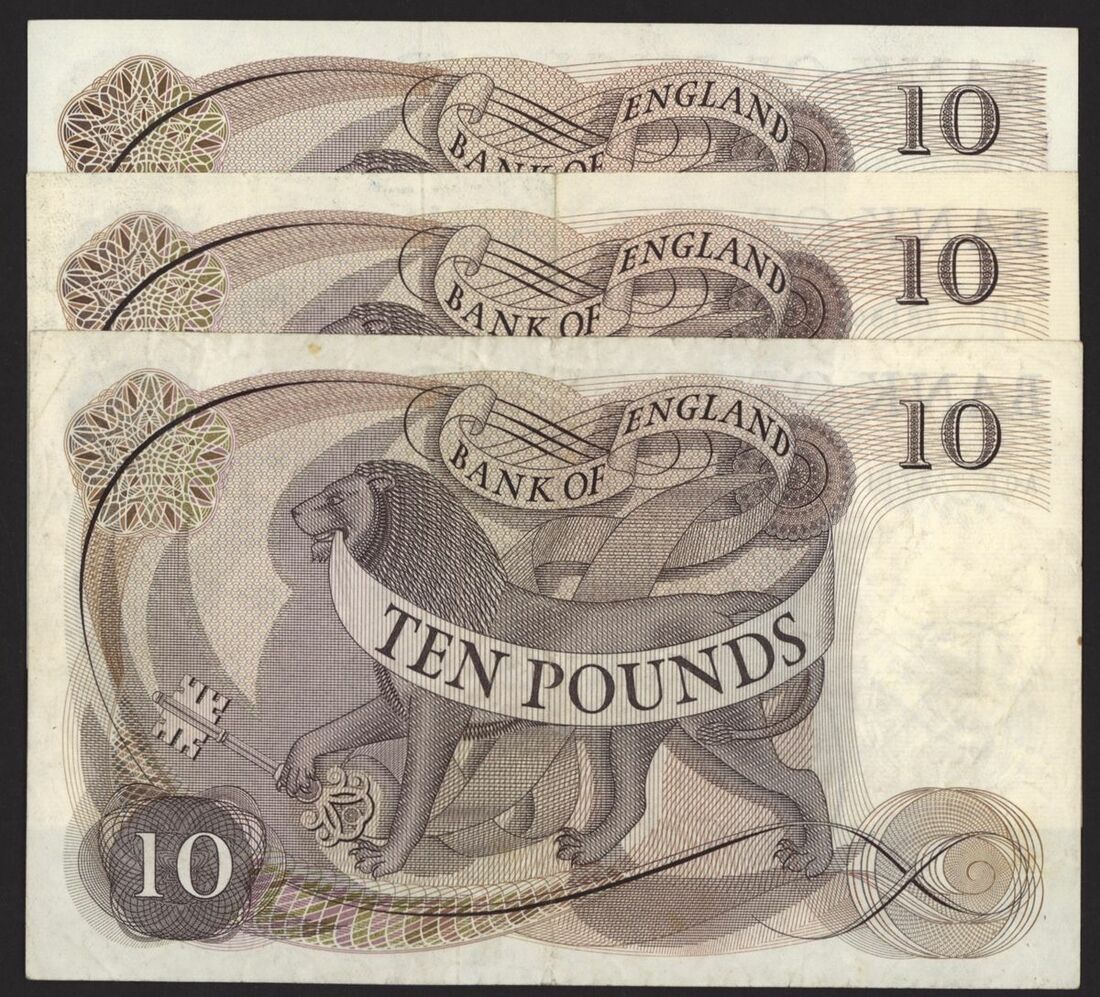 Bank of England, [3 notes] £10, London, ND (1964), J. Q. Hollom, first issue prefix,