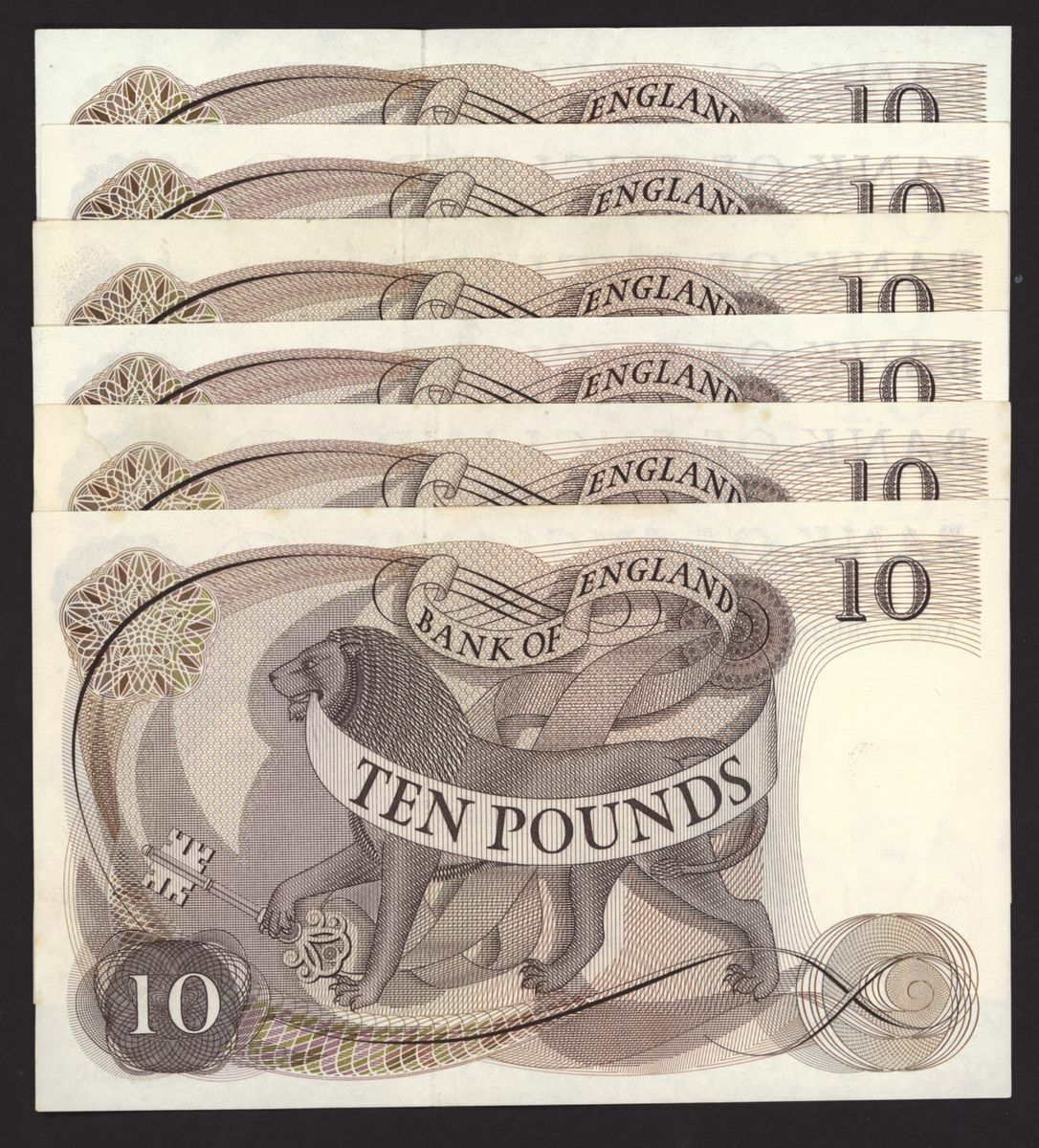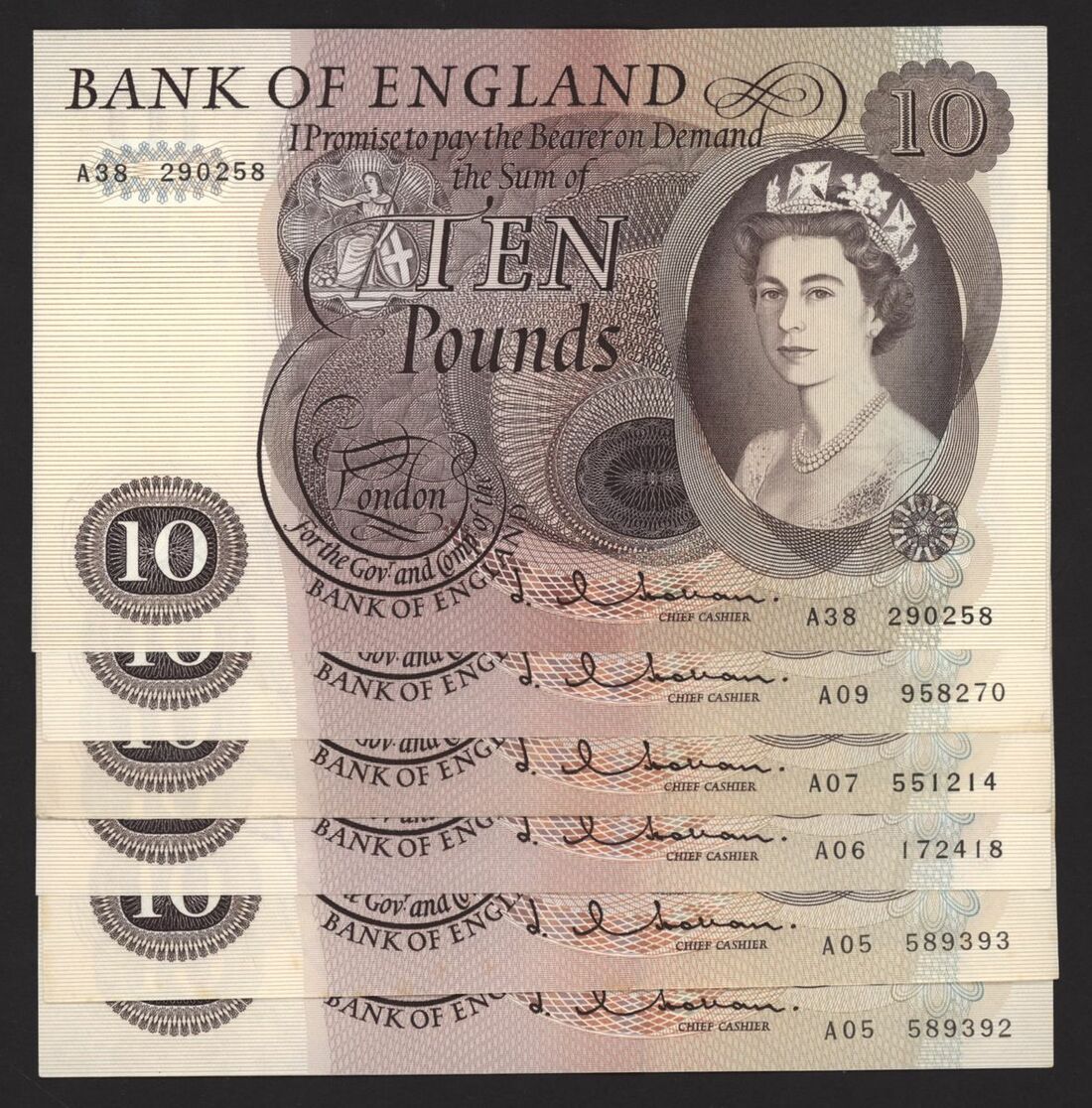 Bank of England, [6 notes] £10, London, ND (1964), J. Q. Hollom, nos. A05 589392-589393, A06 172418, A07 551214, A09 958270, and A38 290258