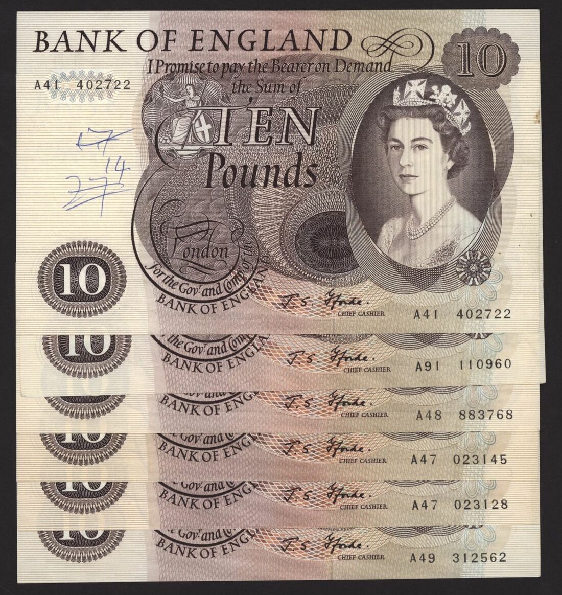 Bank of England, [6 notes] £10, London, ND (1967), J. S. Fforde, first prefix A41 402722, overlap prefix A91 110960, and nos. A47 023128, A47 023145, A48 883768, and A49 312562
