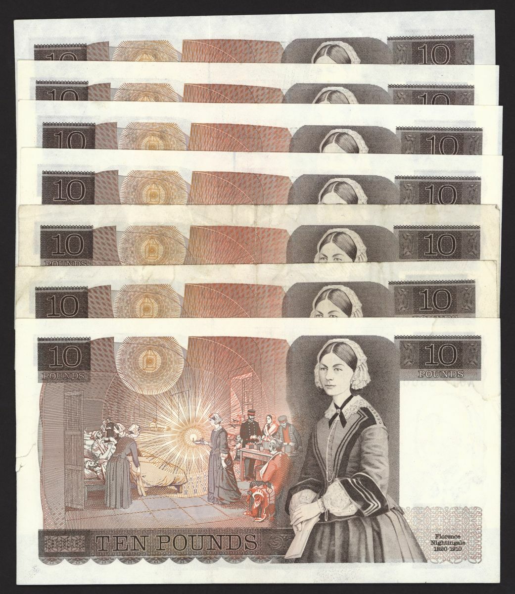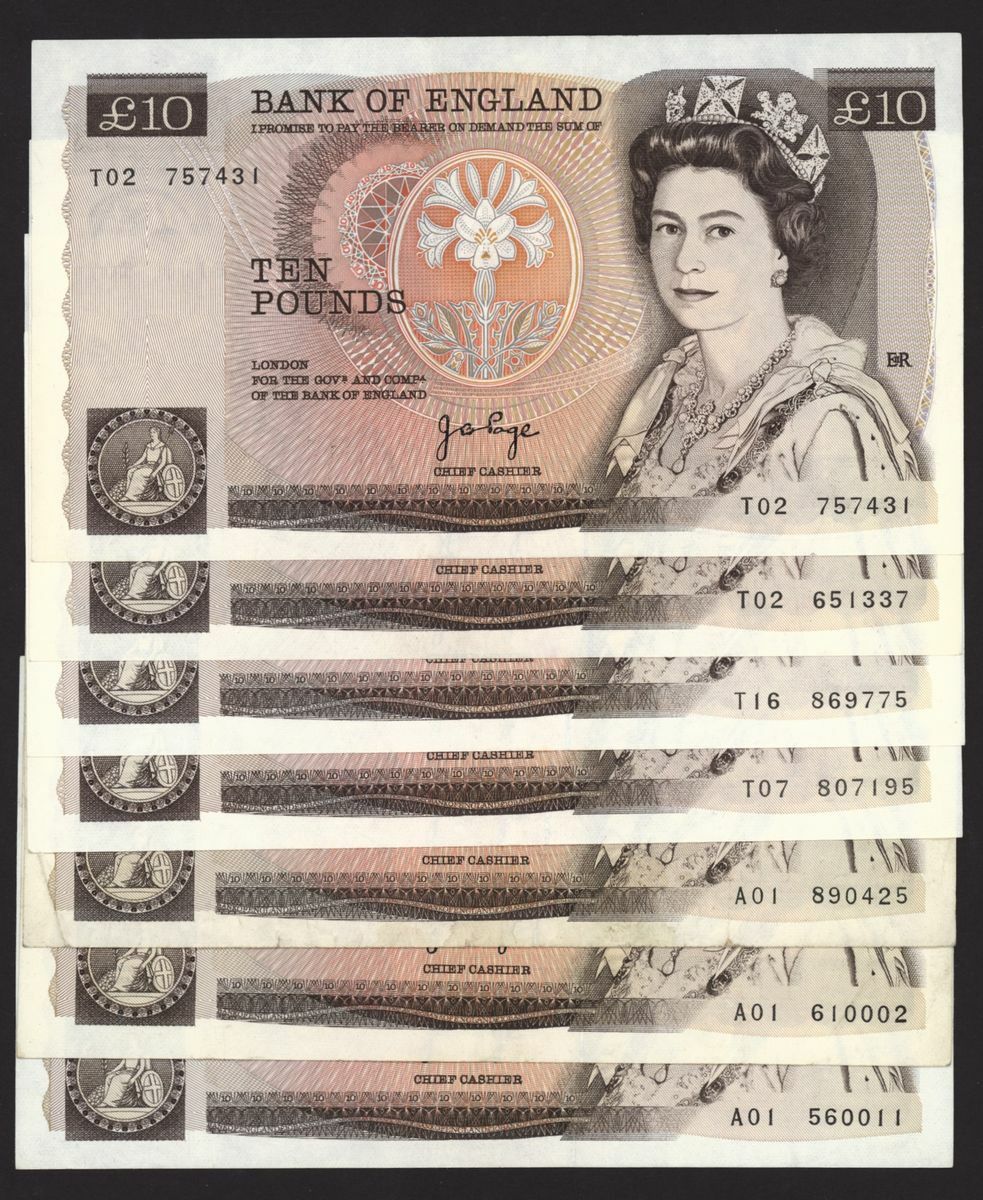 Bank of England, [7 notes] £10, London, ND (1975), J. B. Page, first run prefix A01, nos. 560011, 610002, 890425, one note with a small tear, and last run prefix T, nos. T02 651337, T02 757431, T07 807195, and T16 869775