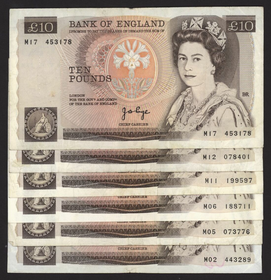 Bank of England, [6 notes] £10, London, ND (1975), J. B. Page, replacement issues,