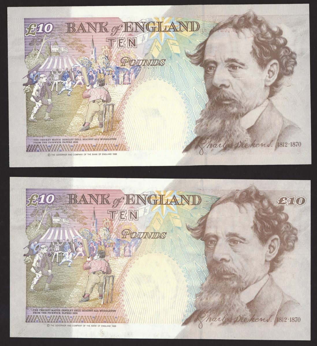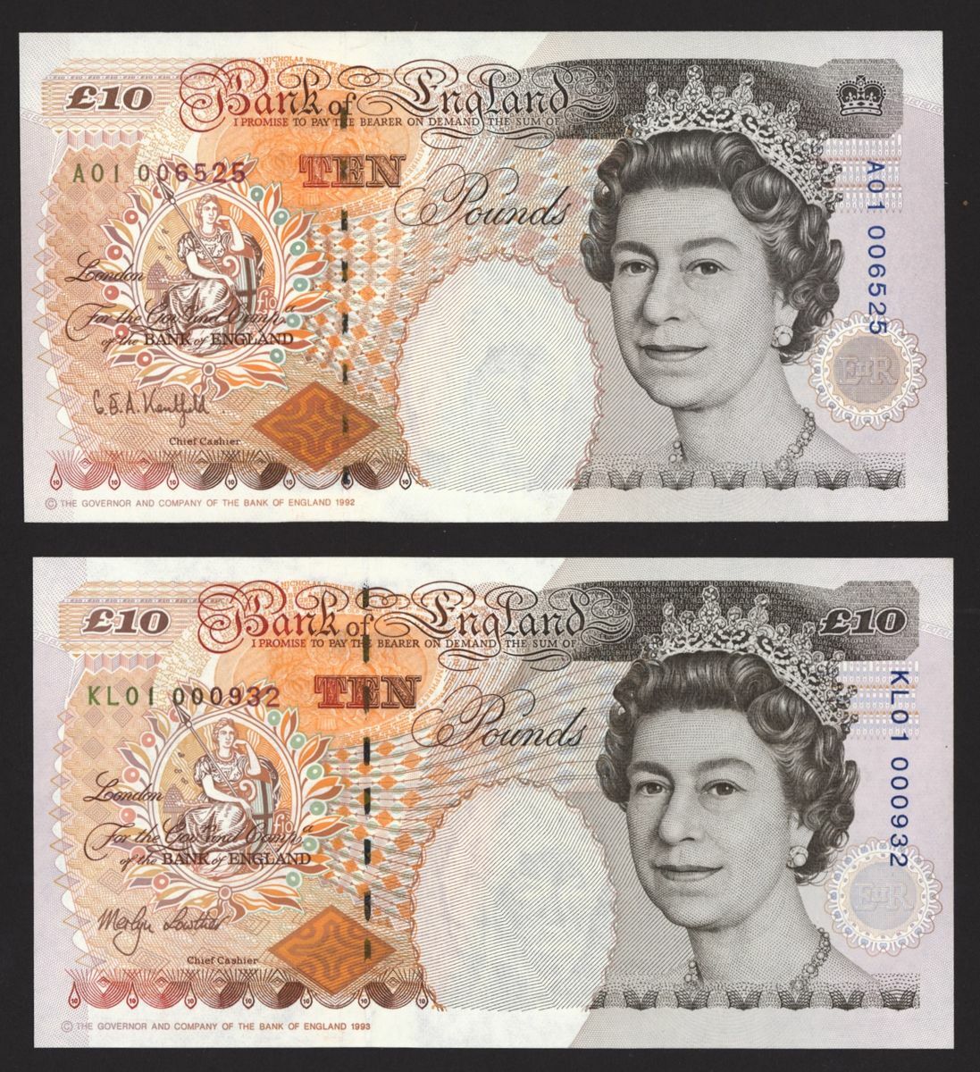 Bank of England, [2 notes] £10, London, ND (1992-1999), G. E. A. Kentfield and M. Lowther, Kentfield, no. A01 006525; Lowther, no. KL01 000932