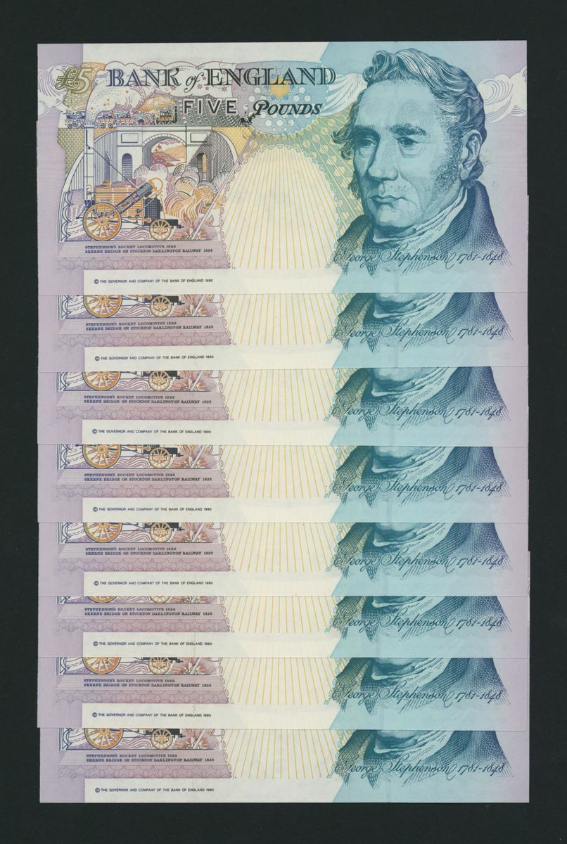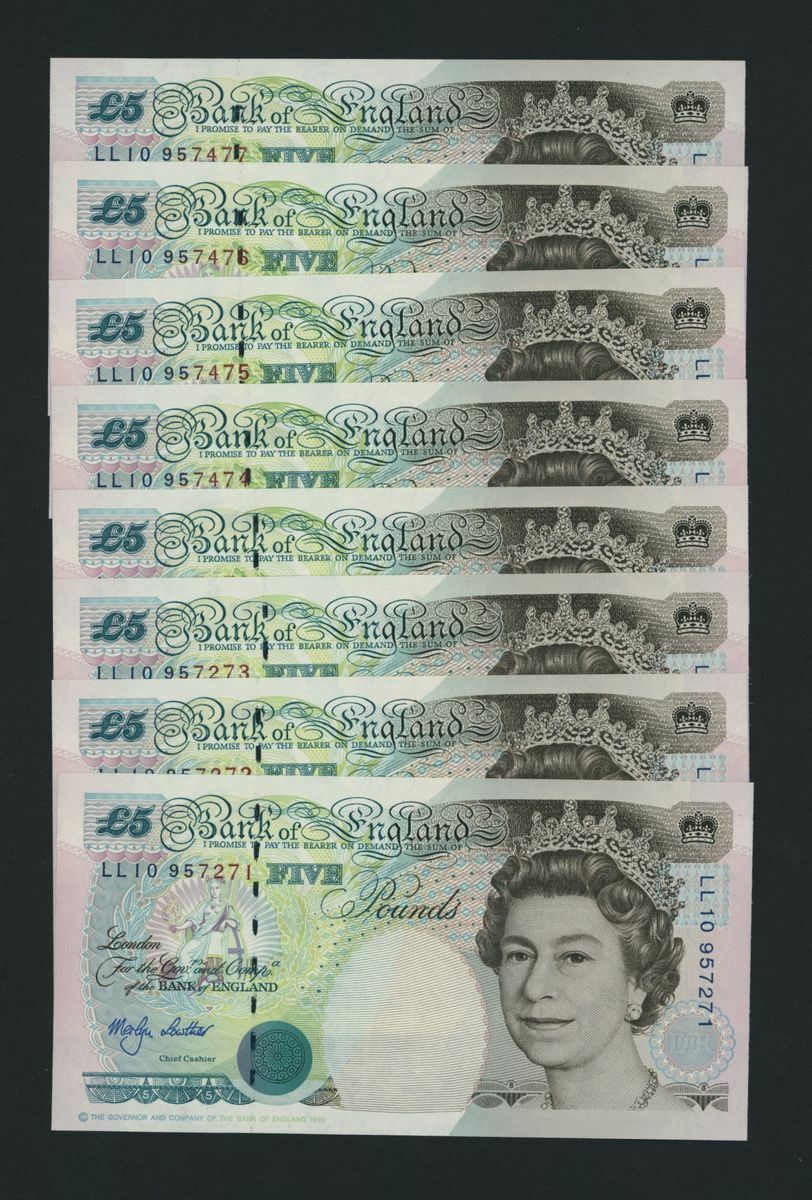 Bank of England, [8 notes] £5, London, ND (1999), M. Lowther, replacement prefix consecutive runs LL10 957271-957273 and LL10 957473-957477