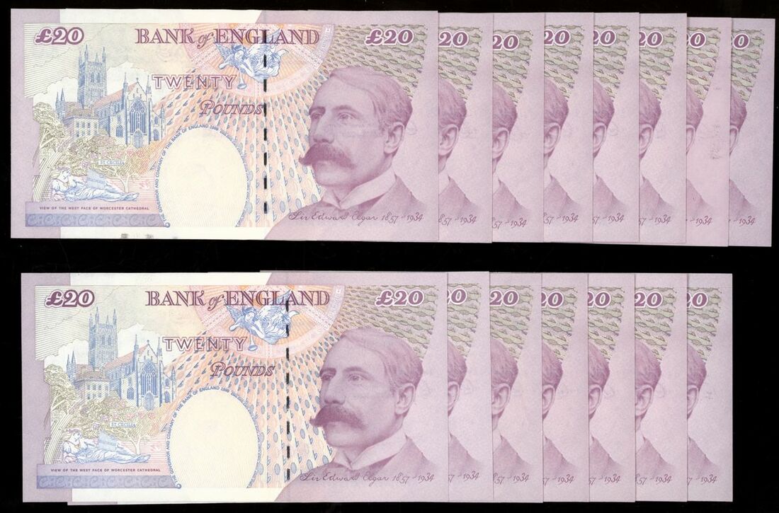 Bank of England, [15 notes] £20, London, ND (1999), M. Lowther, includes first prefixes AD01, CB01, DA01 (3), and DE01 (10), some consecutives