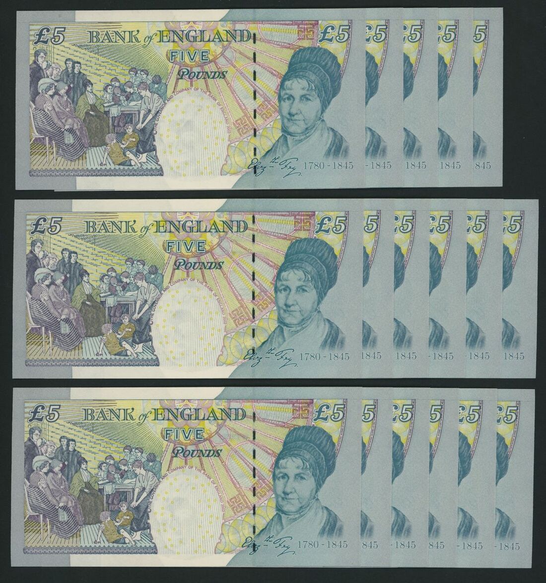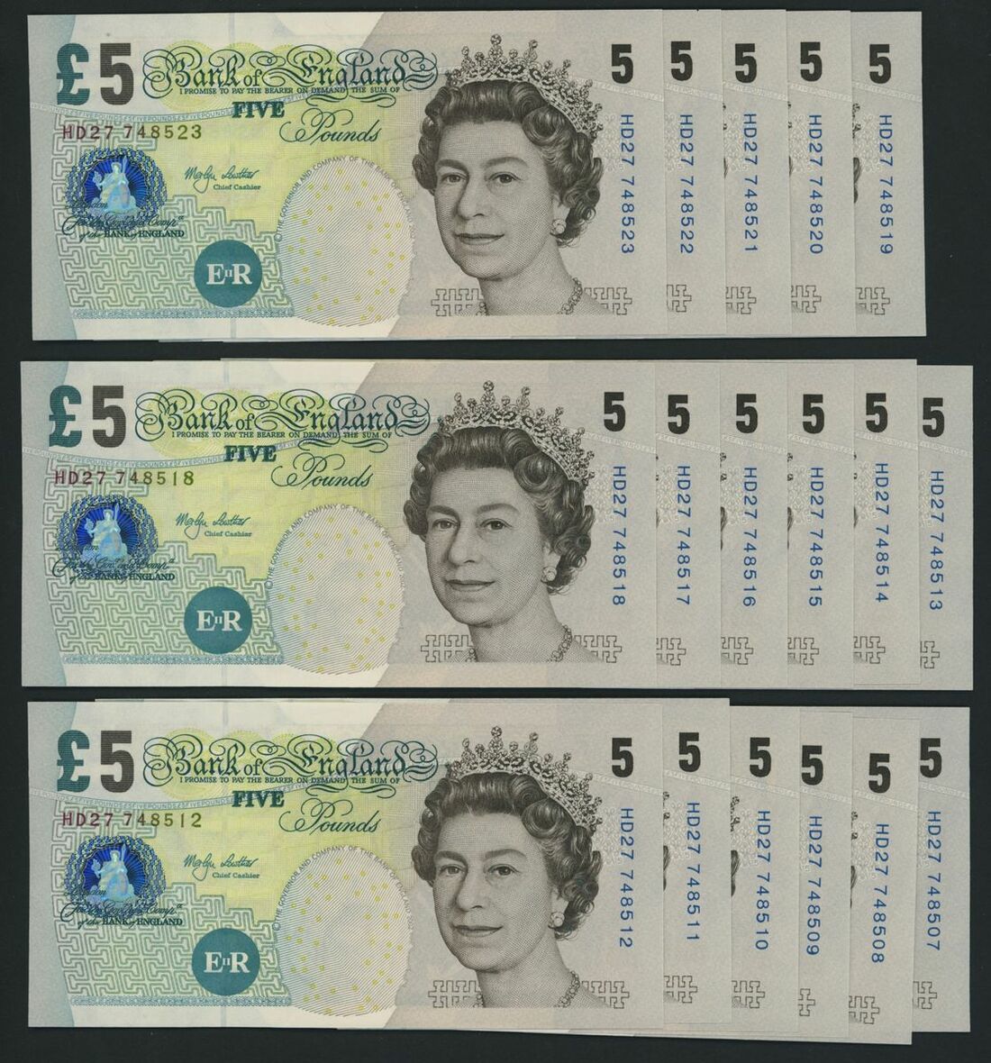 Bank of England, [33 notes] £5, London, ND (2002), M. Lowther, consecutive run, nos. HD27 748507-748539