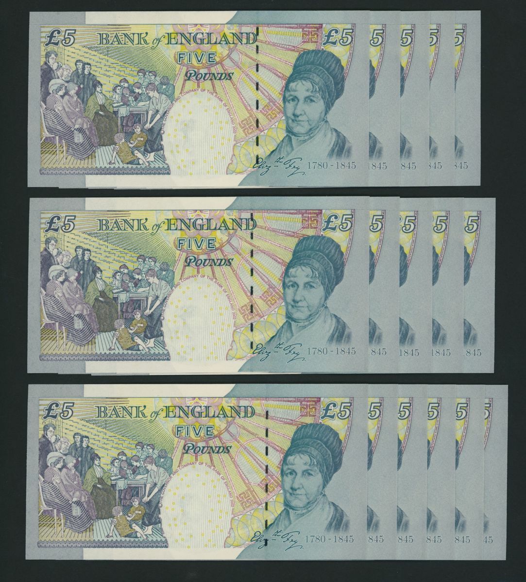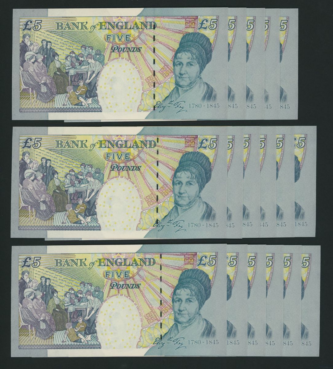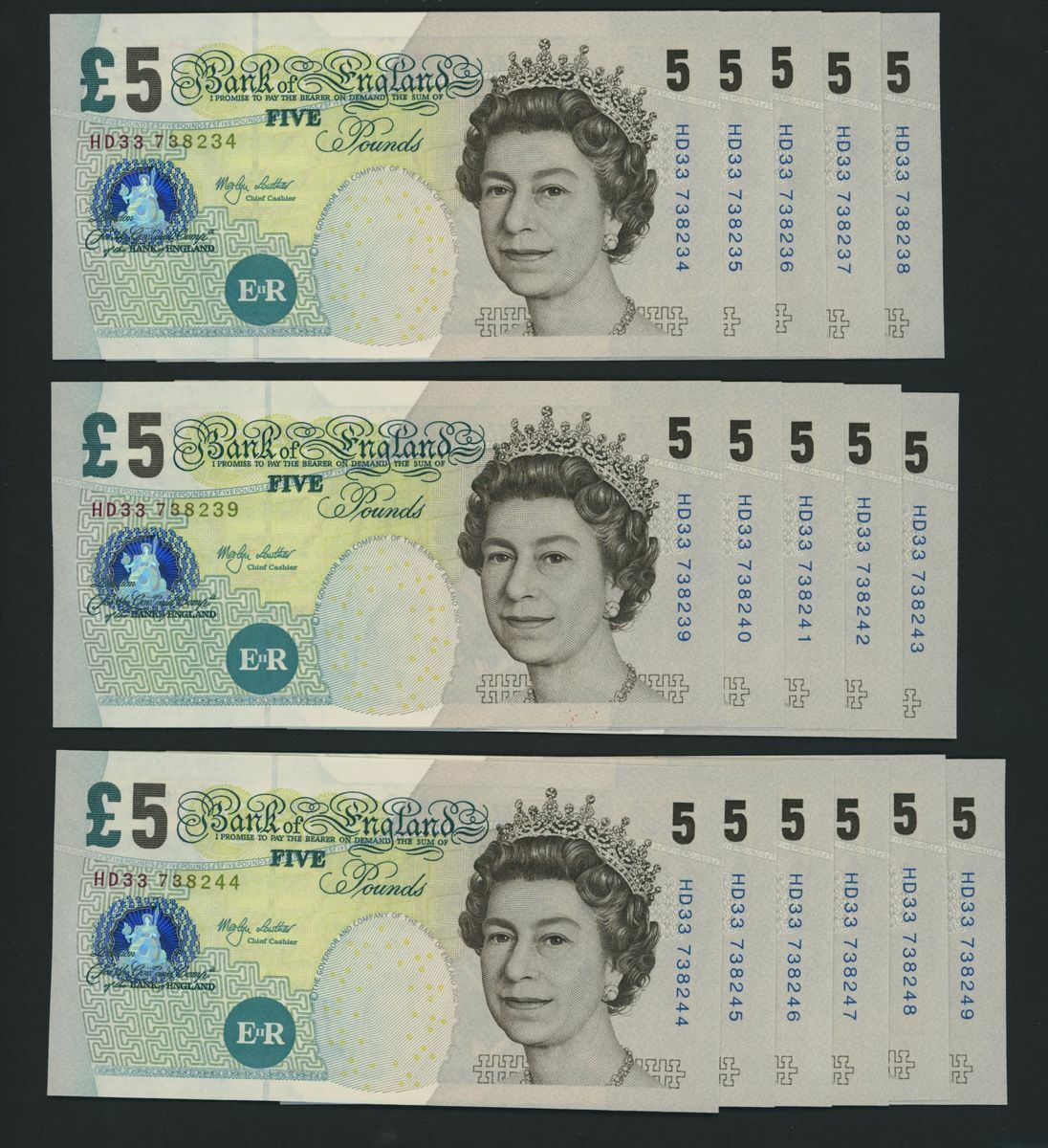 Bank of England, [33 notes] £5, London, ND (2002), M. Lowther, consecutive run, nos. HD33 738234-738266