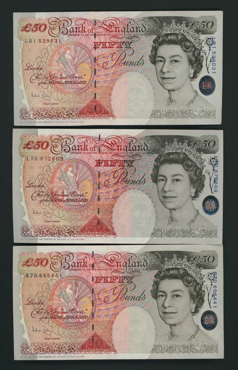 Bank of England, [3 notes] £50, London, ND (2006), A. Bailey, first and last prefixes,