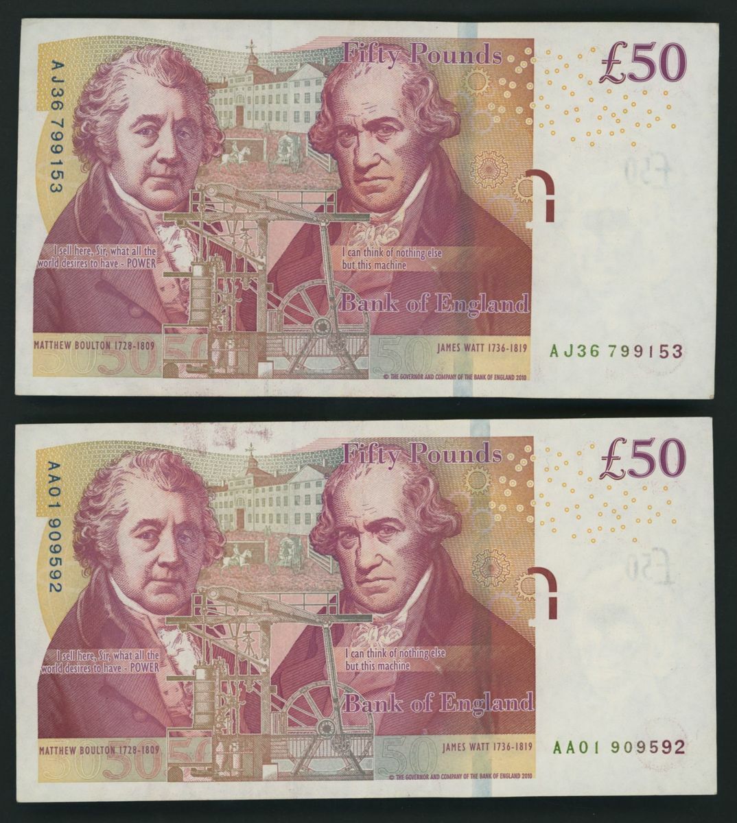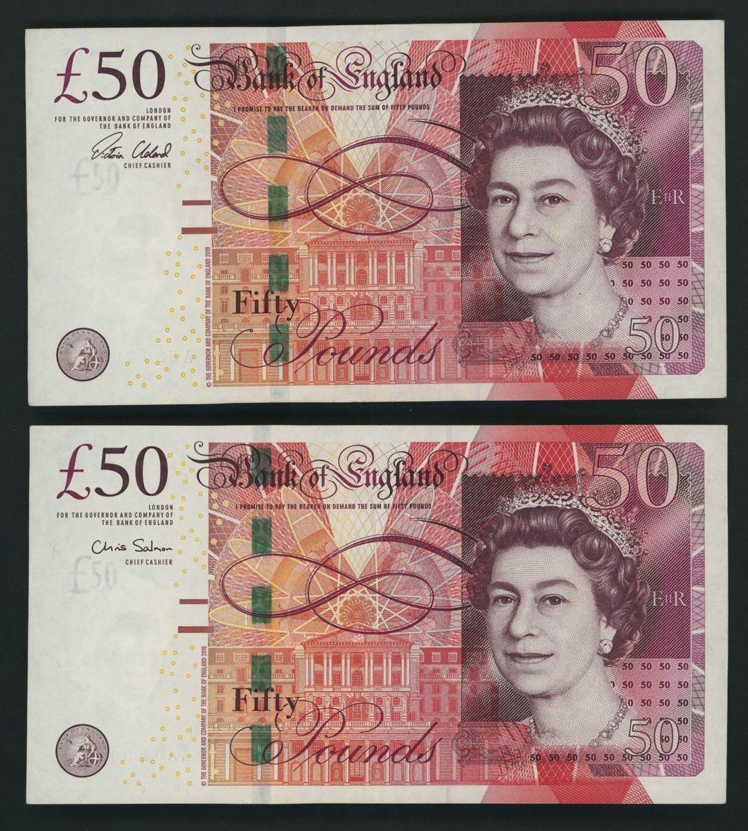Bank of England, [2 notes] £50, London, ND (2011-2015), C. Salmon and V. Cleland,