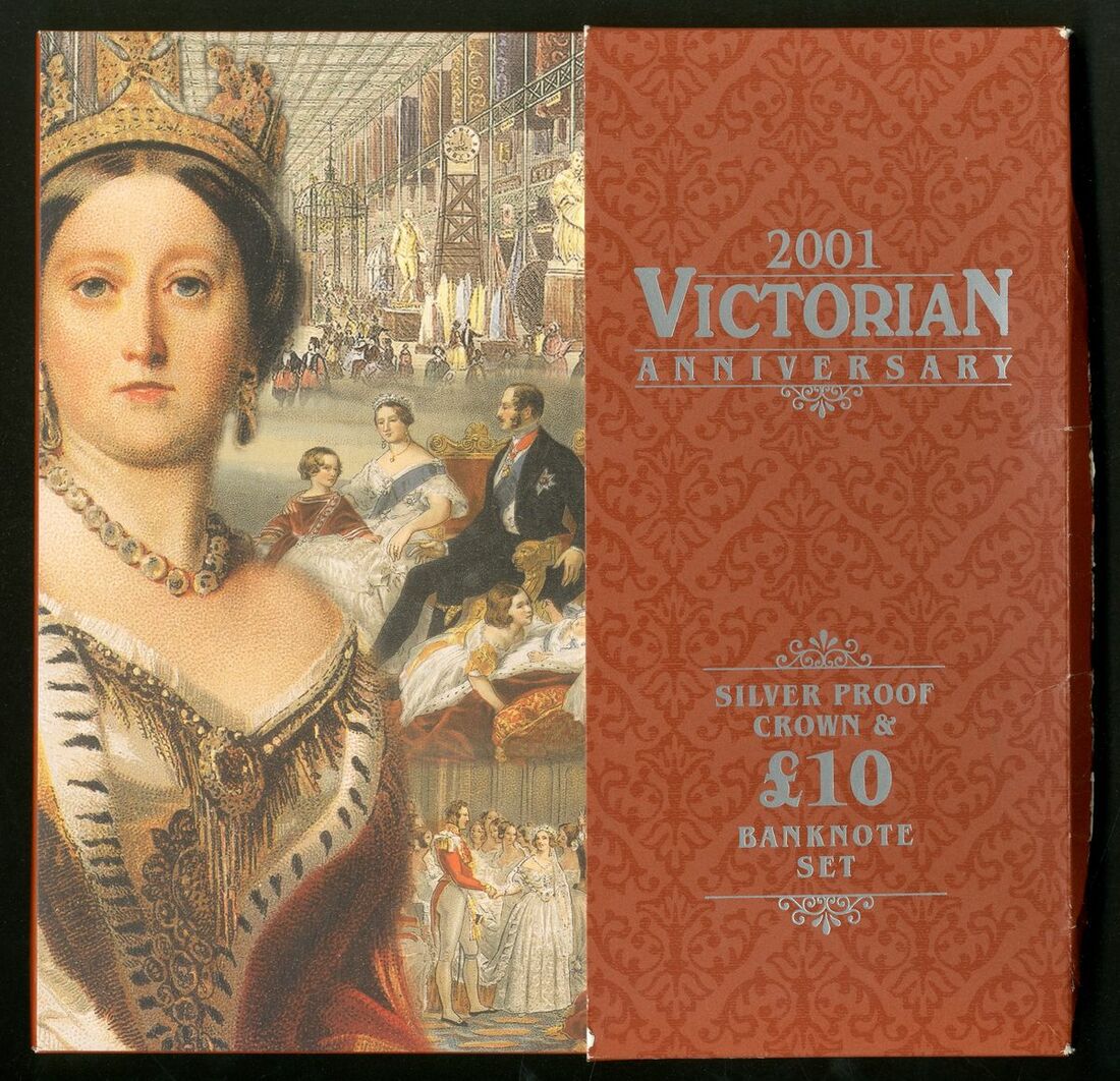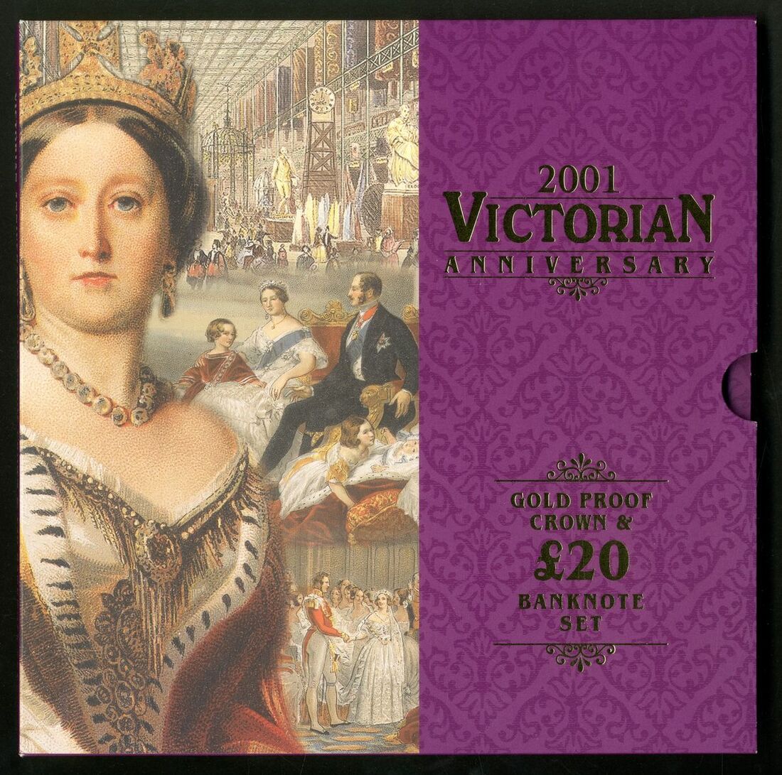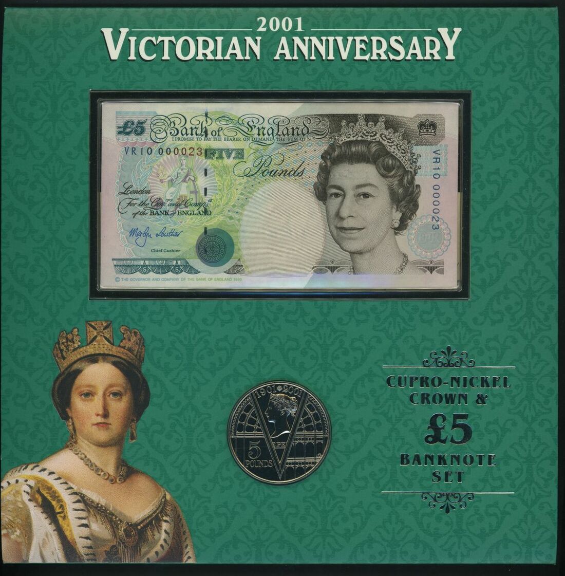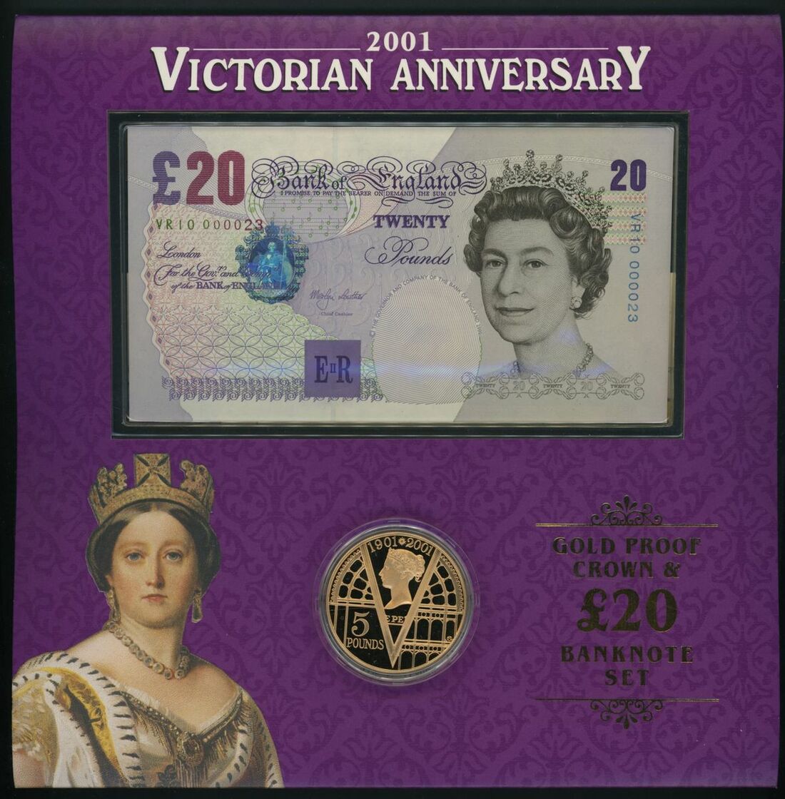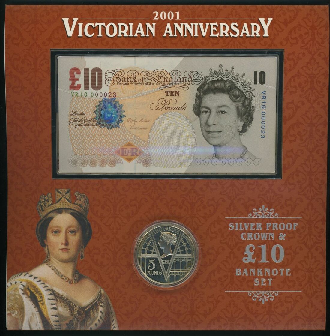 C161 Queen Victoria Anniversary special deluxe edition: £5 VR10 000023 with BU cupro-nickel £5 coin, £10 VR10 000023 with silver proof £5 coin, £20 VR10 000023 (this note only available in this format) with gold proof £5 coin, and booklet celebrating Queen Victoria