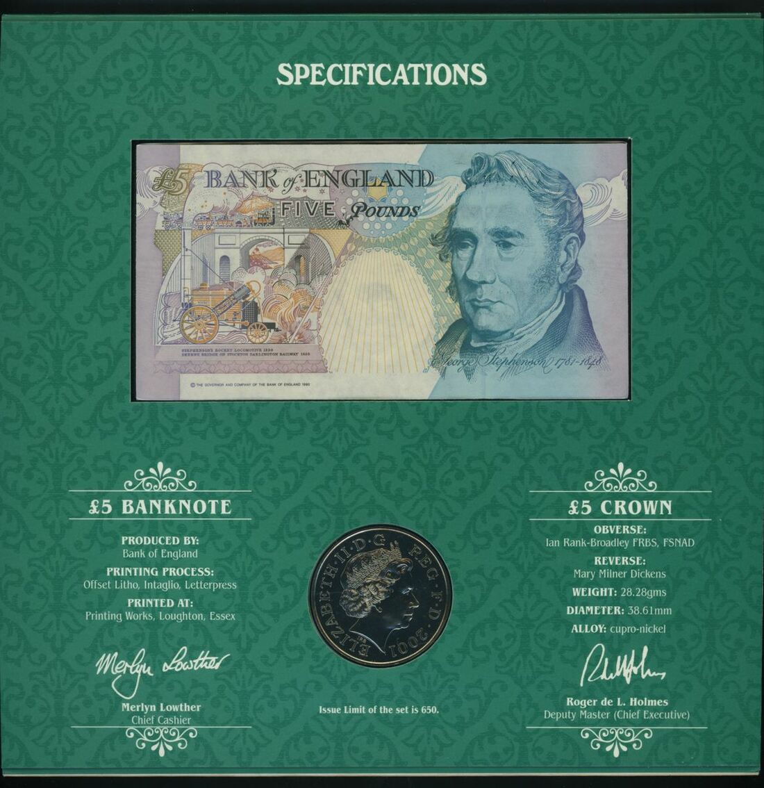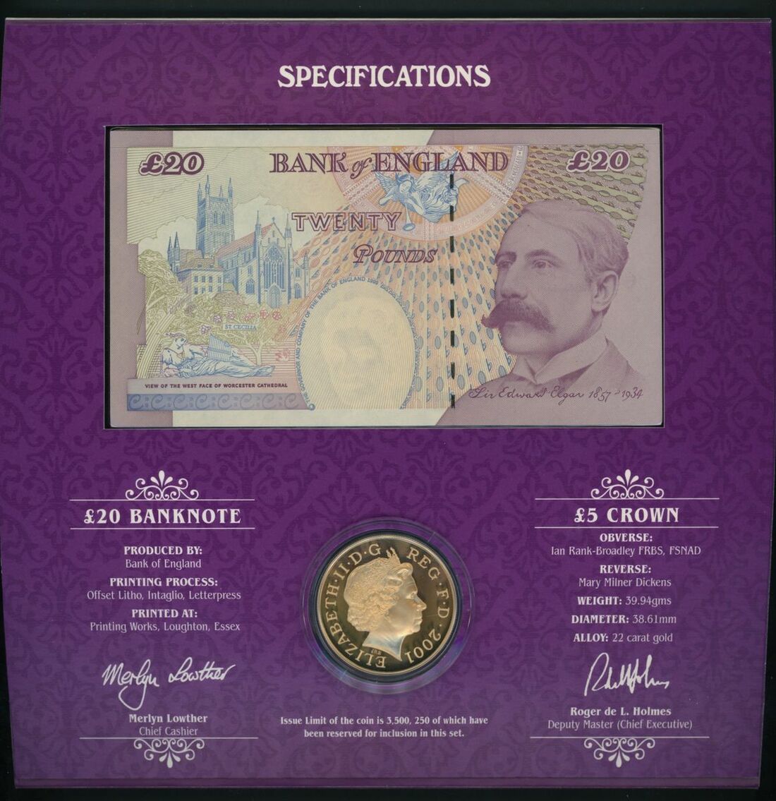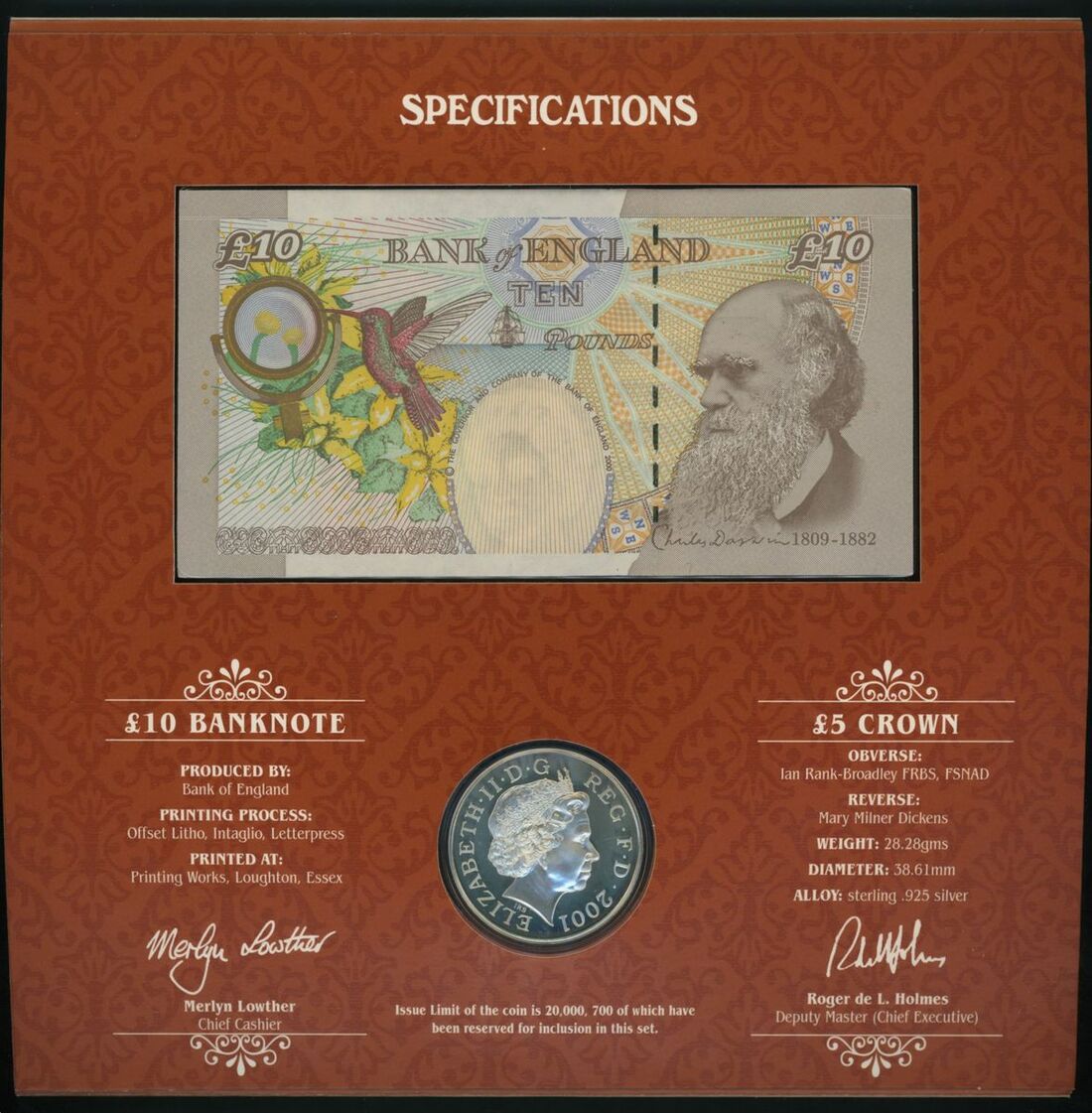 Bank of England, Debden Set C161, presentation box set with 3 packets each containing a note and a coin in holder [3 notes, 3 coins], £5, £10, £20, ND (2001), M. Lowther,