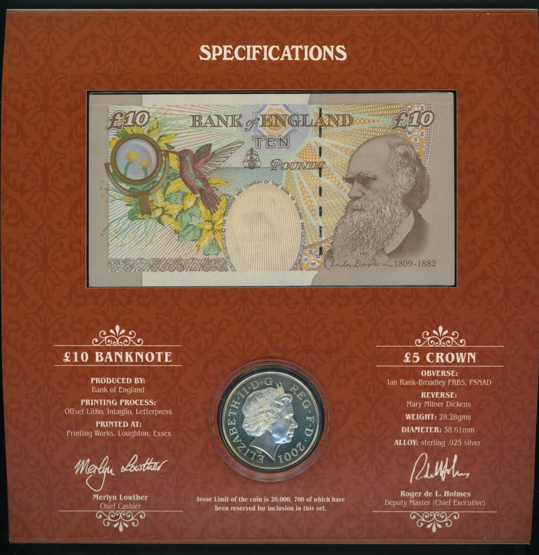 Bank of England, 3 Debden Sets C165 (x2), Set C160, plus a note from Set W102, 3 Debden folders [3 notes, 3 coins], ND (2001-2002), M. Lowther,