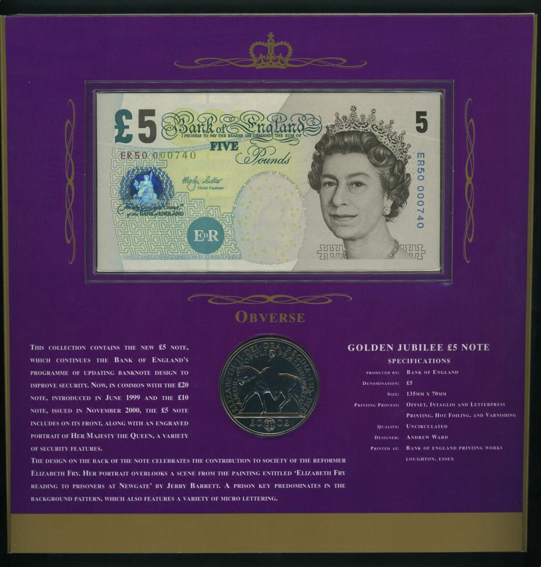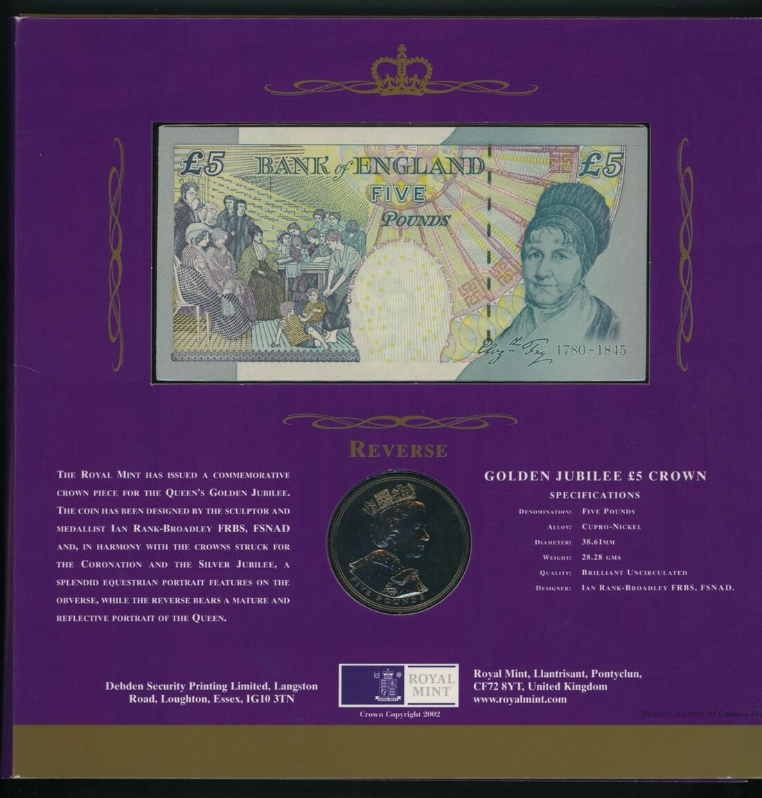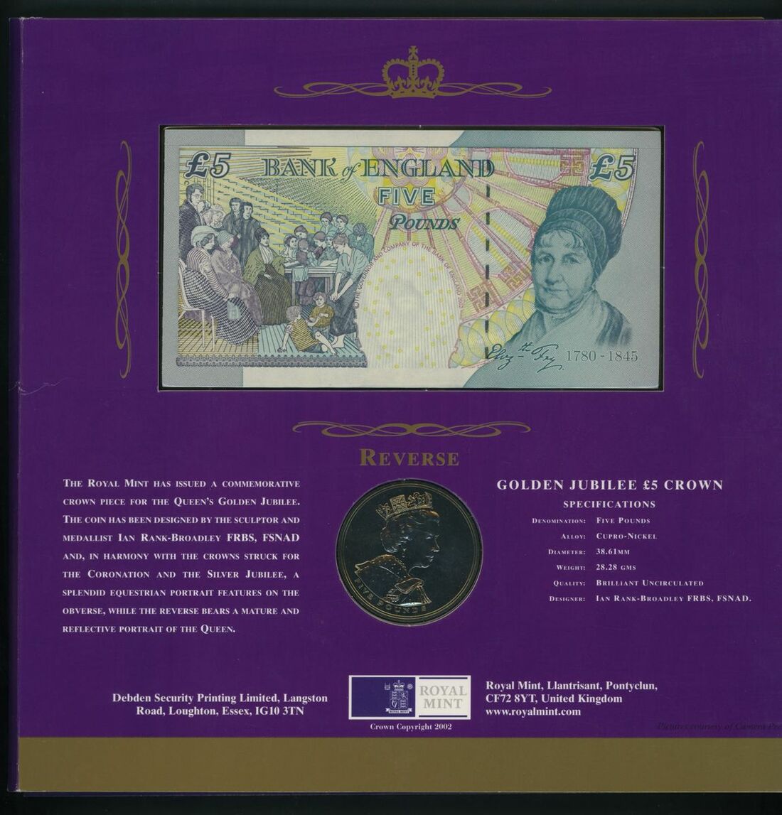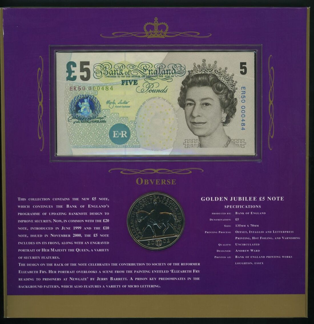 C165 HM The Queen's Golden Jubilee (x2): £5 special prefix ER50 with Royal Mint BU Cupro-Nickel £5 coin, limited edition of 1000 sets, serial numbers ER50 000484 and ER50 000740;