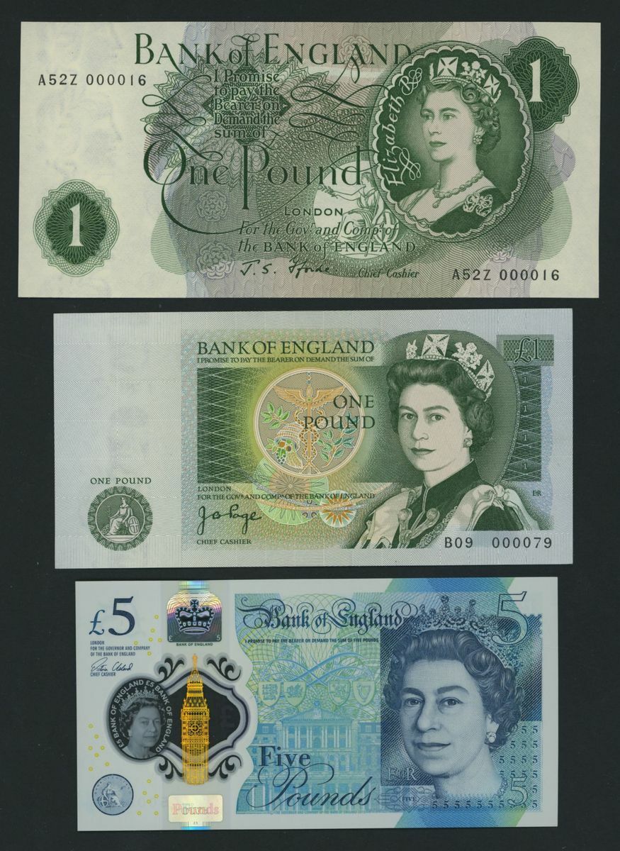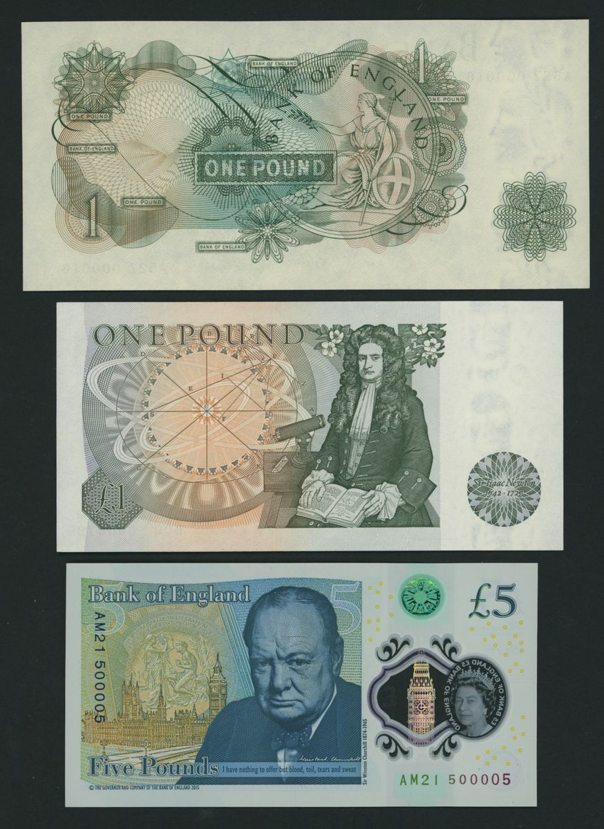 Bank of England, [6 notes] low number notes, £1, £5, £10, £20, ND (1967-2016),
