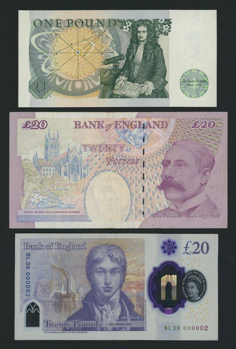 Bank of England, [3 notes] low number notes, £1, £20, ND (1981-2020), D. H. F. Somerset, M. Lowther, S. John,